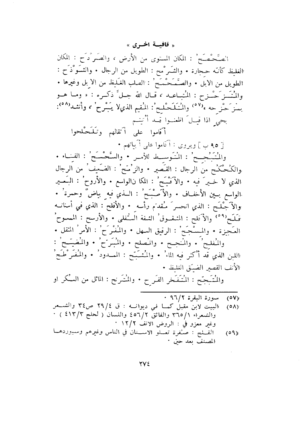 والمتبجح: المتوسط للأمر. والسحسح: الفناء. والكحكح من الرجال: القصير. والزمح: الضعيف من الرجال الذي لا خير فيه. والأفيح: المكان الواسع. والأروح: البعير الواسع بين الأخفاف. والأصبح: الذي فيه بياض وحمرة. والأجلح: الذي انحسر مقدم رأسه. والأقلح: الذي في أسنانه قلح. والأفلح: المشقوق الشفة السفلى. والأرسح: الممسوح العجيزة. والمسجح: الرقيق السهل. والمفرح: الأمر المثقل. والمفلح. والمنجح. والمصلح. والمبرح. والمضيح: اللبن الذي قد أكثر فيه الماء. والمشبح: الممدود. والمفرطح الأنف القصير الضيق الغليظ. والمتبجح: المتفخر الفرح. والمترنح: المائل من السكر أو