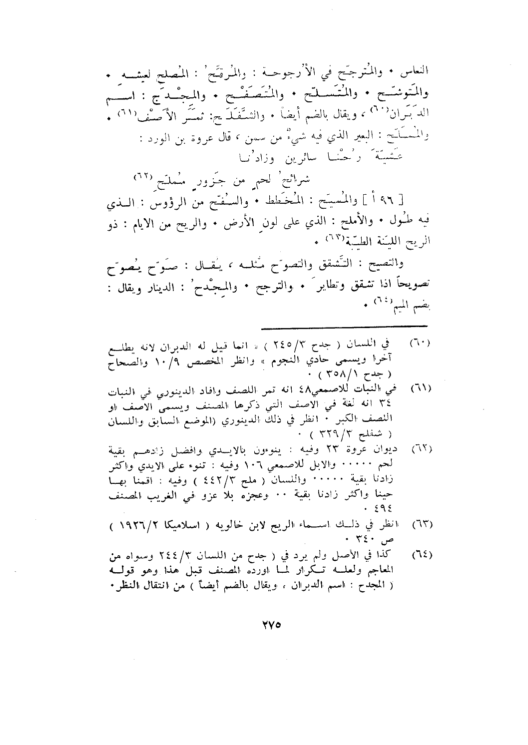 النعاس. والمترجح في الأر جوحة: والمرقح: المصلح لعيشه. والمتوشح. والمتسلح. والمتصفح. والمجدج: اسم الدبران، ويقال بالضم أيضا. والشفلح: ثمر الأصف. والمسلح: البعير الذي فيه شيء من سمن، قال عروة بن الورد: