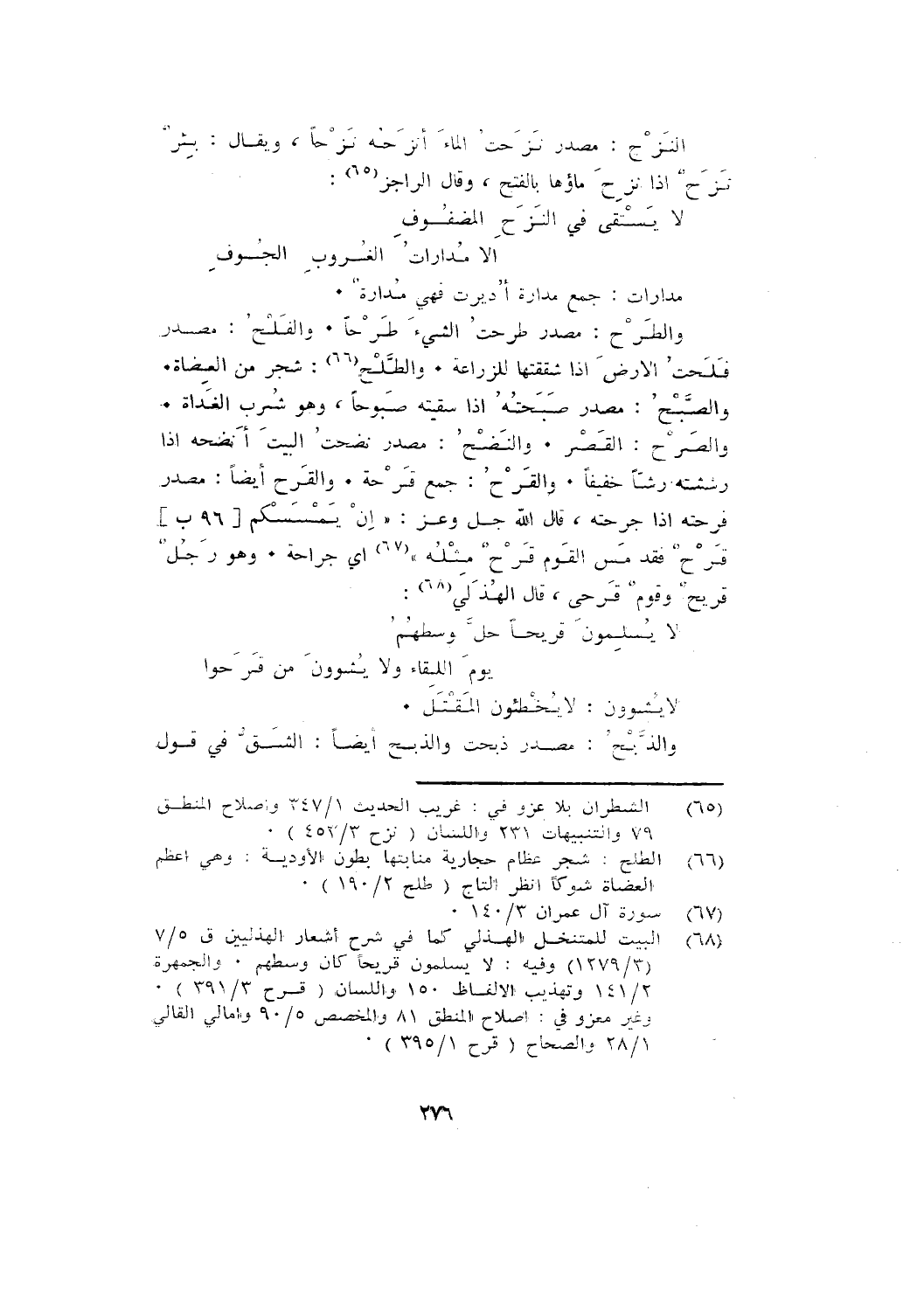 والطرح: مصدر طرحت الشيء طرحًا. والفلح: مصدر فلحت الأرض إذا شققتها للزراعة. والطلح: شجر من العضاة. والصبح: مصدر صبحته إذا سقيته صبوحًا، وهو شرب الغداة. والصرح: القصر. والنضح: مصدر نضحت البيت أنضحه إذا رشته رشًّا خفيفًا. والقرح: جمع قرحة. والقرح أيضًا: مصدر فرحته إذا جرحته، قال الله جل وعز: {إِنْ يَمْسَسْكُمْ قَرْحٌ فَقَدْ مَسَّ الْقَوْمَ قَرْحٌ مِثْلُهُ} أي جراحة. وهو رجل قريح وقوم قرحى، قال الهذلي: