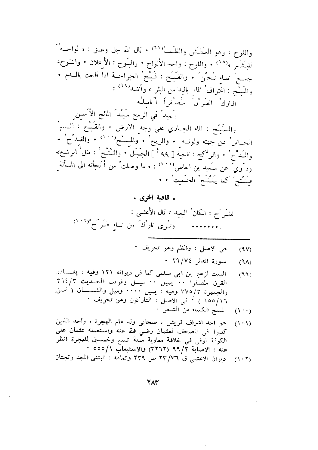 والسيح: الماء الجاري على وجه الأرض. والقيح: الدم الحائل عن جهته ولونه. والريح. والمسح. والقدح. والمدح. والركح: ناحية الجبل. والنتح: مثل الرشح، وروي عن سعيد بن العاص: " ما وصلت من ألجأته إلى المسألة فينتج كما ينتج الحميت ".