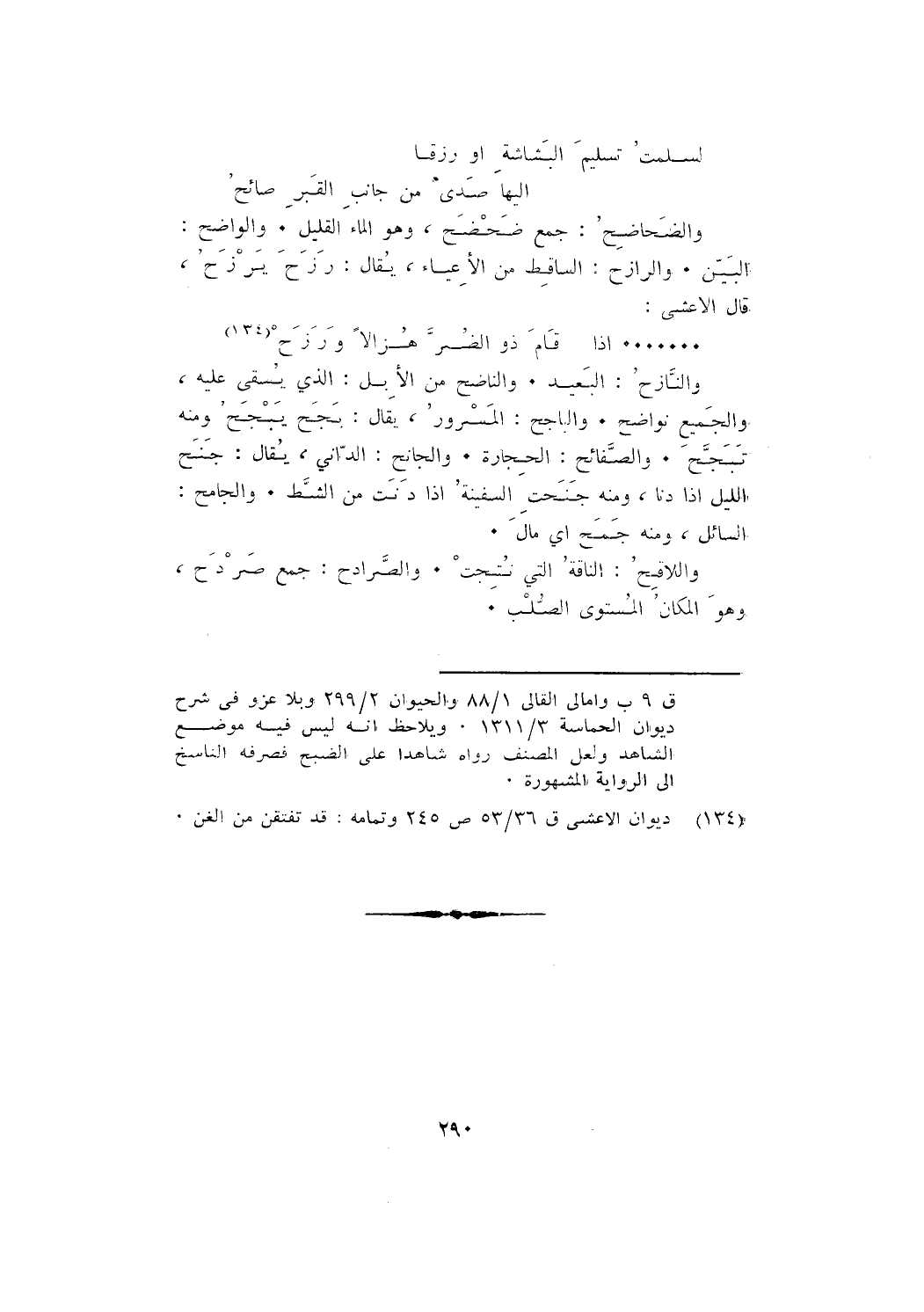 والنازح: البعيد. والناصح من الإبل: الذي يسقى عليه، والجميع نواضح. والباجح: المسرور، يقال: بجح يبجح، ومنه تبجح. والصفائح: الحجارة. والجانح: الداني، يقال: جنح الليل إذا دنا، ومنه جنحت السفينة إذا دنت من الشط. والجامح: السائل، ومنه جمح؛ أي: مال.