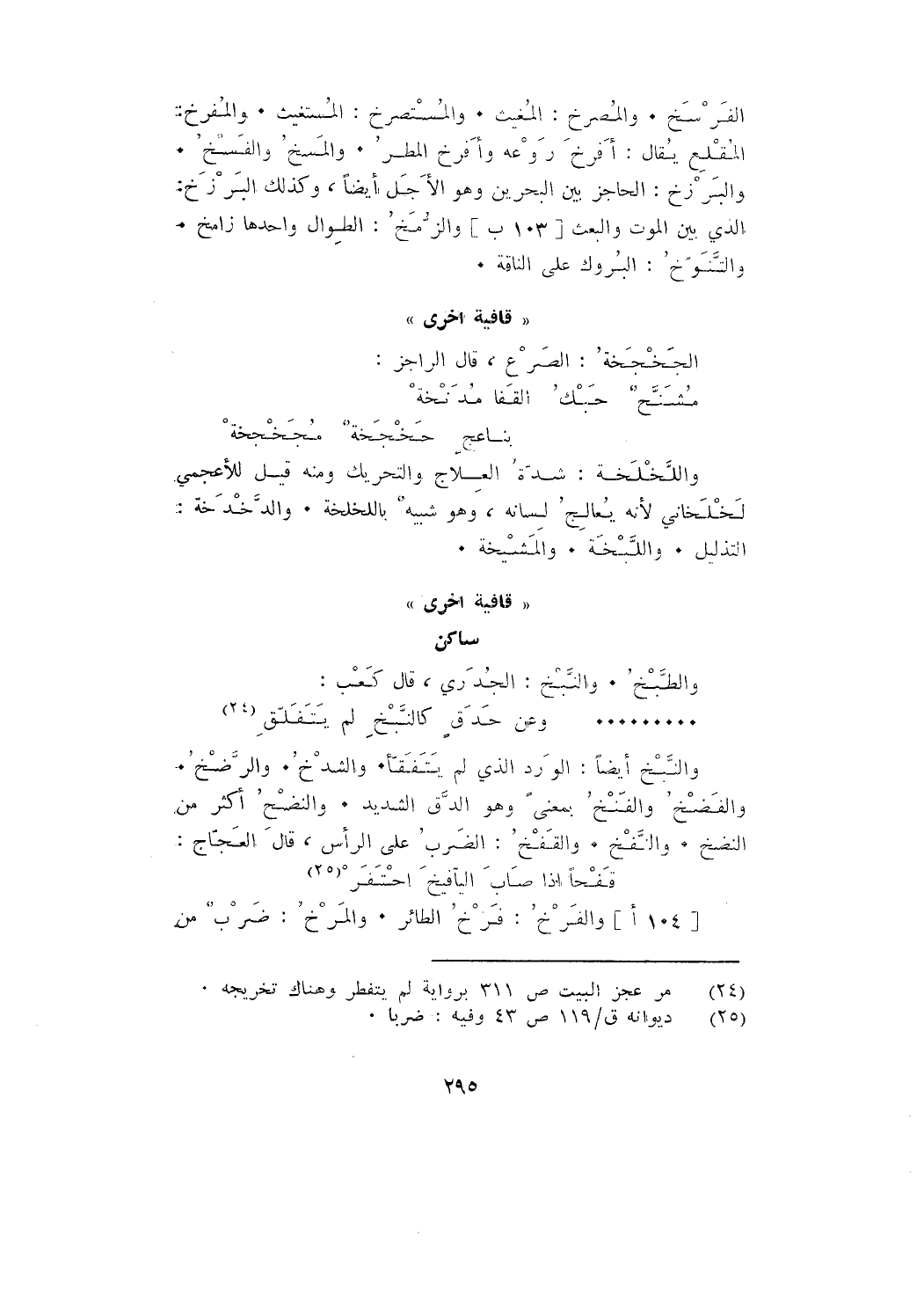 الفرسخ. والمصرخ: المغيث. والمستصرخ: المستغيث. والمفرخ: المقلع يقال: أفرخ روعه وأفرخ المطر. والمسخ والفسخ. والبرزخ: الحاجز بين البحرين وهو الأجل أيضًا، وكذلك البرزخ: الذي بين الموت والبعث [103 ب] والزمخ: الطوال واحدها زامخ.