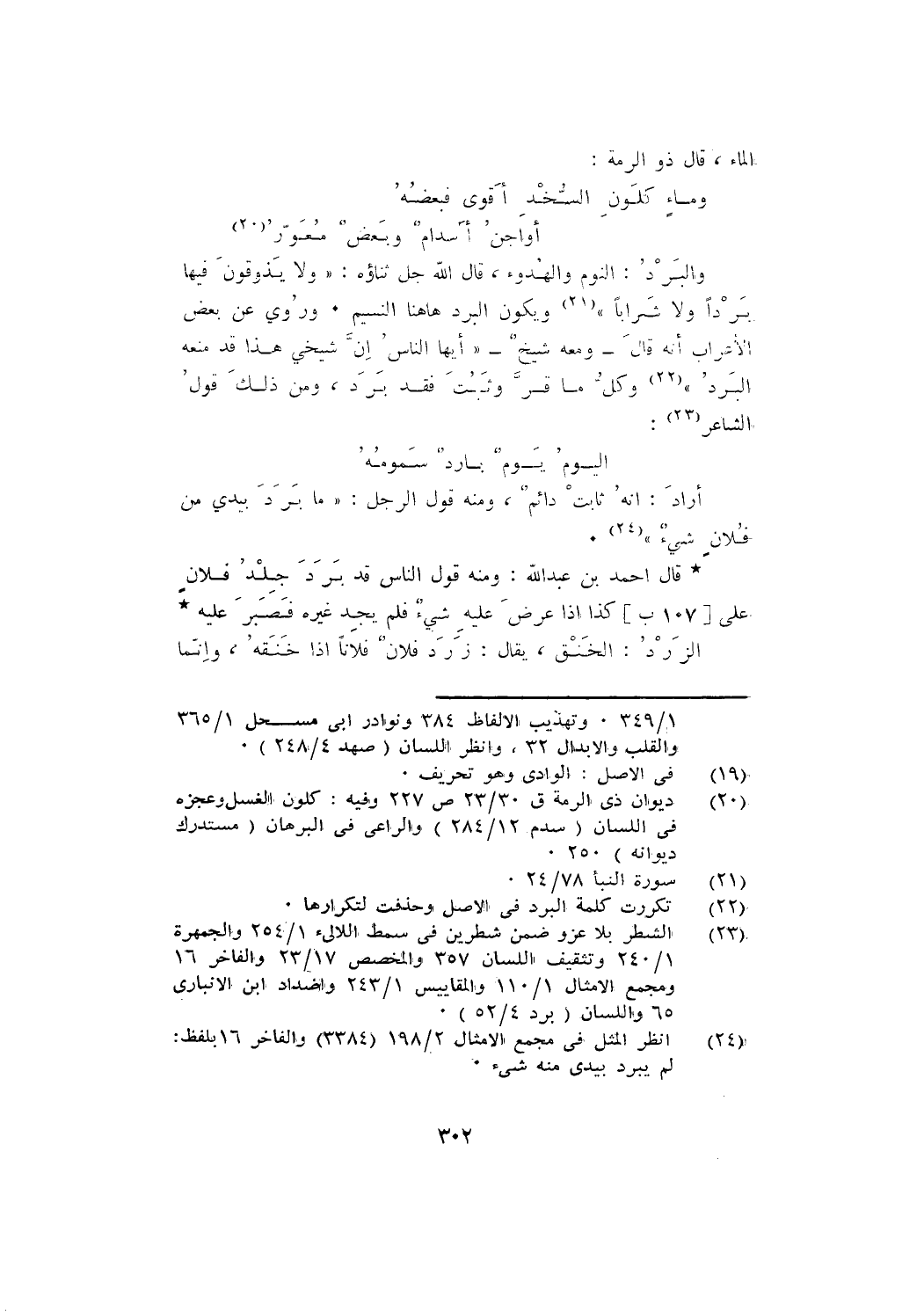 والبرد: النوم والهدوء، قال الله جل ثناؤه: {لَا يَذُوقُونَ فِيهَا بَرْدًا وَلَا شَرَابًا} ويكون البرد هاهنا النسيم. وروي عن بعض الأعراب أنه قال - ومعه شيخ - " أيها الناس إن شيخي هذا قد منعه البرد " وكل ما قر وثبت فقد برد، ومن ذلك قول الشاعر:
