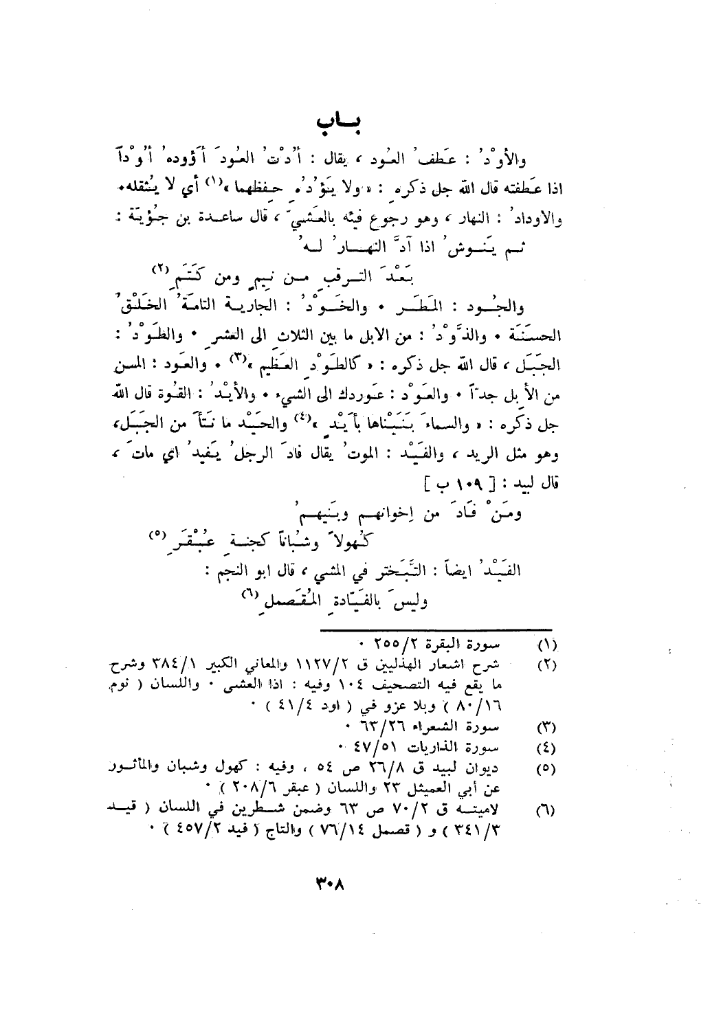 والجود: المطر. والخود: الجارية التامة الخلق الحسنة. والذود: من الإبل ما بين الثلاث إلى العشر. والطود: الجبل، قال الله جل ذكره: {كَالطَّوْدِ الْعَظِيمِ}. والعود: المسن من الإبل جدًّا. والعود: عوردك إلى الشيء. والأيد: القوة قال الله جل ذكره: {وَالسَّمَاءَ بَنَيْنَاهَا بِأَيْدٍ} والحيد ما نتأ من الجبل، وهو مثل الريد، والفيد: الموت يقال فاد الرجل؛ أي: مات، قال لبيد: [109 ب]