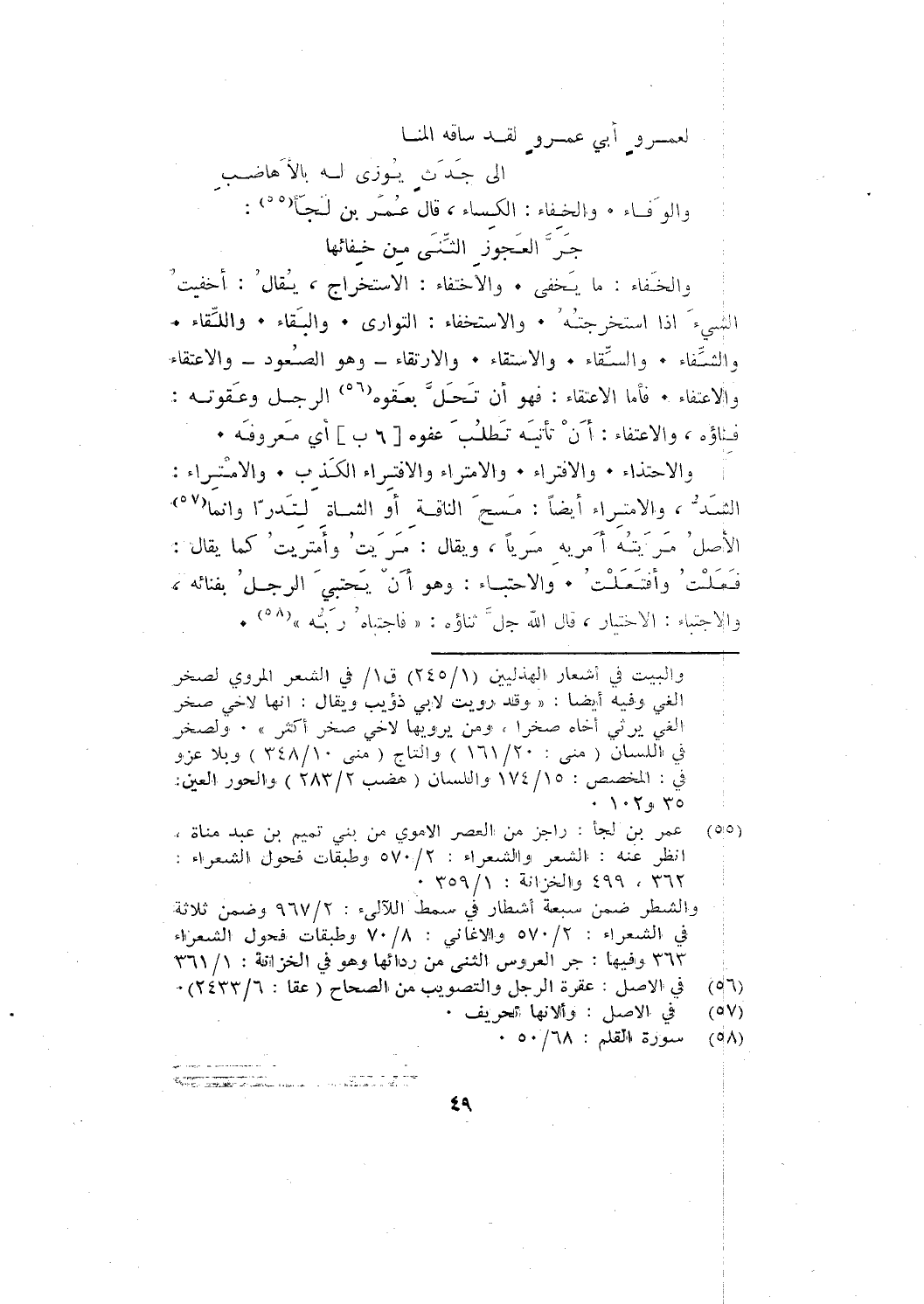 وَالْخَفَاءُ: ما يخفى. والاختفاء: الاستخراج، يقال: أخفيت الشيء الذي إذا استخرجتُهُ. والاستخفاء: التواري: والبقاء. واللِّقَاء. والشِّفَاءُ. والسِّقَاءُ. والاستقاء. والارتقاء - وهو الصُّعُود - والاعتقاء والاعتفاء. فأما الاعتقاء: فهو أن تَحَلَّ بعَقوه الرجل وَعَقْوته: فِنَاؤُهَ، والاعتفاء: أن تأتيه تطلب عفوه؛ أي: مَعْرُوفَهُ.