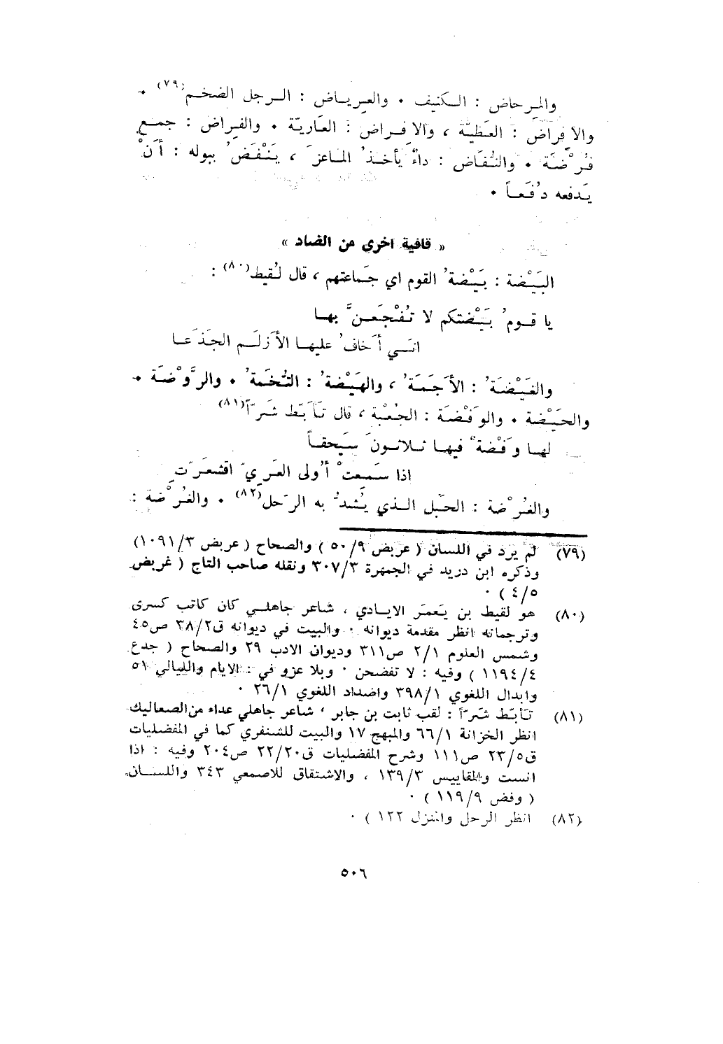 والغيضة: الأجمة، والهيضة: التخمة. والروضة. والحيضة. والوفضة: الجعبة، قال تأبط شرا: