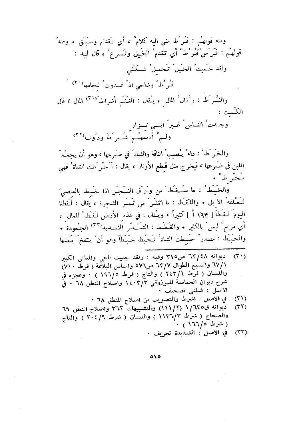 والخيط: ما سقط من ورق الشجر إذا خبط بالعصى لتعلفه الإبل. واللقط: ما انتثر من ثمر الشجرة، يقال: لقطنا اليوم لقطا كثيرا. ويقال: في هذه الأرض لقط للمال، أي مرتع ليس بالكثير. والقطط: الشعر الشديد الجعودة.
