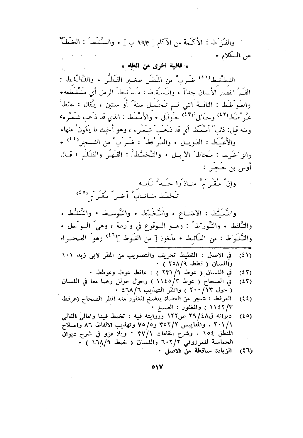 القطقط: ضرب من المطر صغير القطر. واللطلط: الفم القصير الأسنان جدا. والمسقط: مسقط الرمل أي منقطعه. والعوطط: الناقة التي لم تحمل سنة او سنتي، يقال: عائط عوطط وحائل حولل. والأمعط: الذي قد ذهب شعره، ومنه قيل: ذئب أمعط أي قد ذهب شعره، وهو أخبث ما يكون منها. والأعيط: الطويل. والعرفط: ضرب من الشجر.
