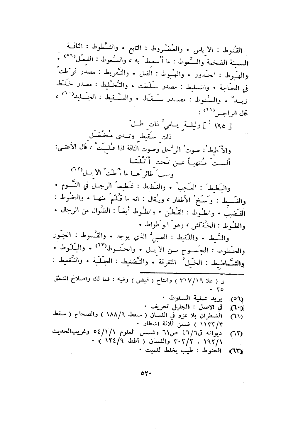القنوط: الإياس. والعضروط: التابع. والشطوط: الناقة السمينة الضخمة والسعوط: ما أسعط به، والسعوط: الفعل. والهبوط: الحدور. والهبوط: الفعل. والتفريط: مصدر فرطت في الحاجة. والتسليط: مصدر سلطت. والتخليط: مصدر خلط زيد. والسقوط: مصدر سقط. والسقيط: الجليد، قال الراجز: