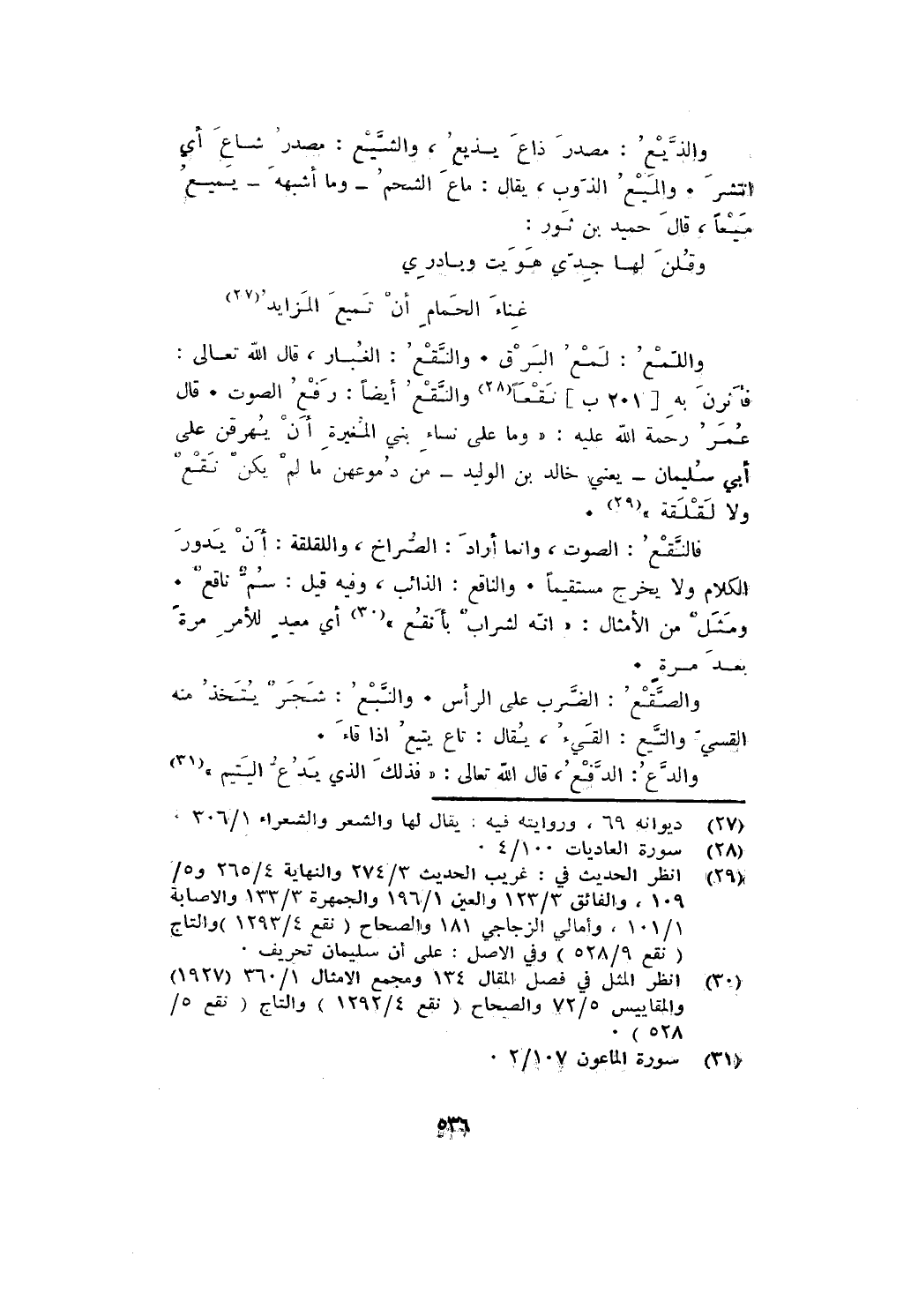 واللمع: لمع البرق. والنقع: الغبار، قال الله تعالى: {فَأَثَرْنَ بِهِ نَقْعًا} والنقع أيضًا: رفع الصوت. قال عمر رحمة الله عليه: " وما على نساء بني المغيرة ان يهرقن على أبي سليمان - يعني خالد بن الوليد - من دموعهن ما لم يكن نقع ولا لقلقة ".