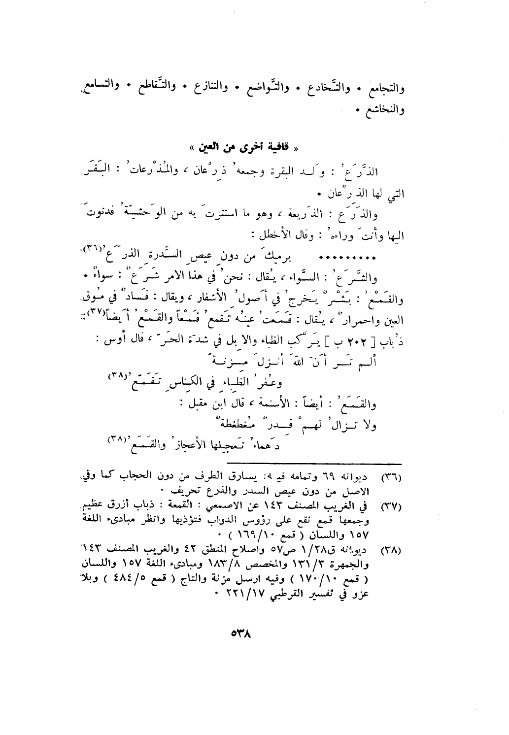 والشرع: السواء، يقال: نحن في هذا الأمر شرع: سواء. والقمع: بشر يخرج في أصول الأشفار، ويقال: فساد في موق العين واحمرار، يقال: قمعت عينه تقمع قمعا والقمع أيضا: ذباب يركب الظباء والإبل في شدة الحر، قال أوس: