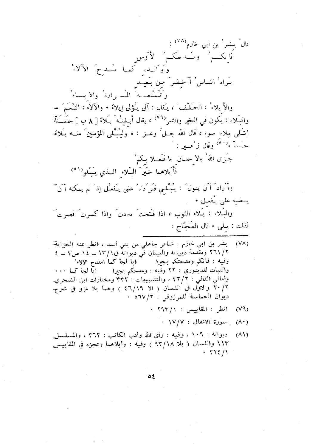وَالأيلاء: الحَلْفُ، يُقَالُ: آلَى يُؤْلى إِيلَاءً. وَالآلاء: النِّعَمُ. والبلاء: يكون في الخير والشر، يُقَالُ: أَبْلَيْتُهُ بَلَاءً حَسَنًا. ابْتُلِيَ بِبَلَاءِ سَوْءٍ، قال الله جل وعز: {وَلِيُبْلِيَ الْمُؤْمِنِينَ مِنْهُ بَلَاءً حَسَنًا} وقال زهير: