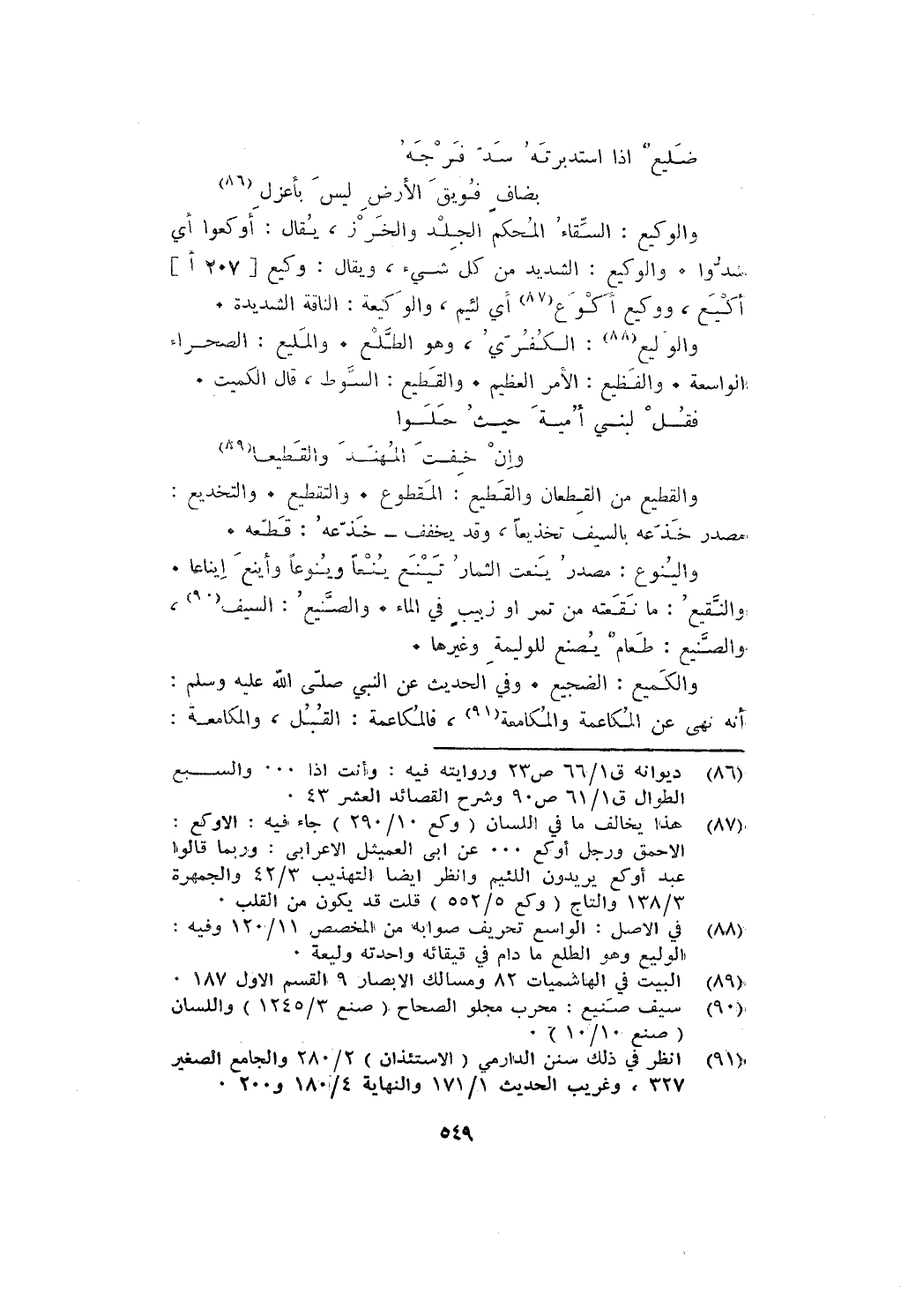 والوليع: الكفرى، وهو الطلع. والمليع: الصحراء الواسعة. والفظع: الأمر العظيم. والقطع: السوط، قال الكميت: