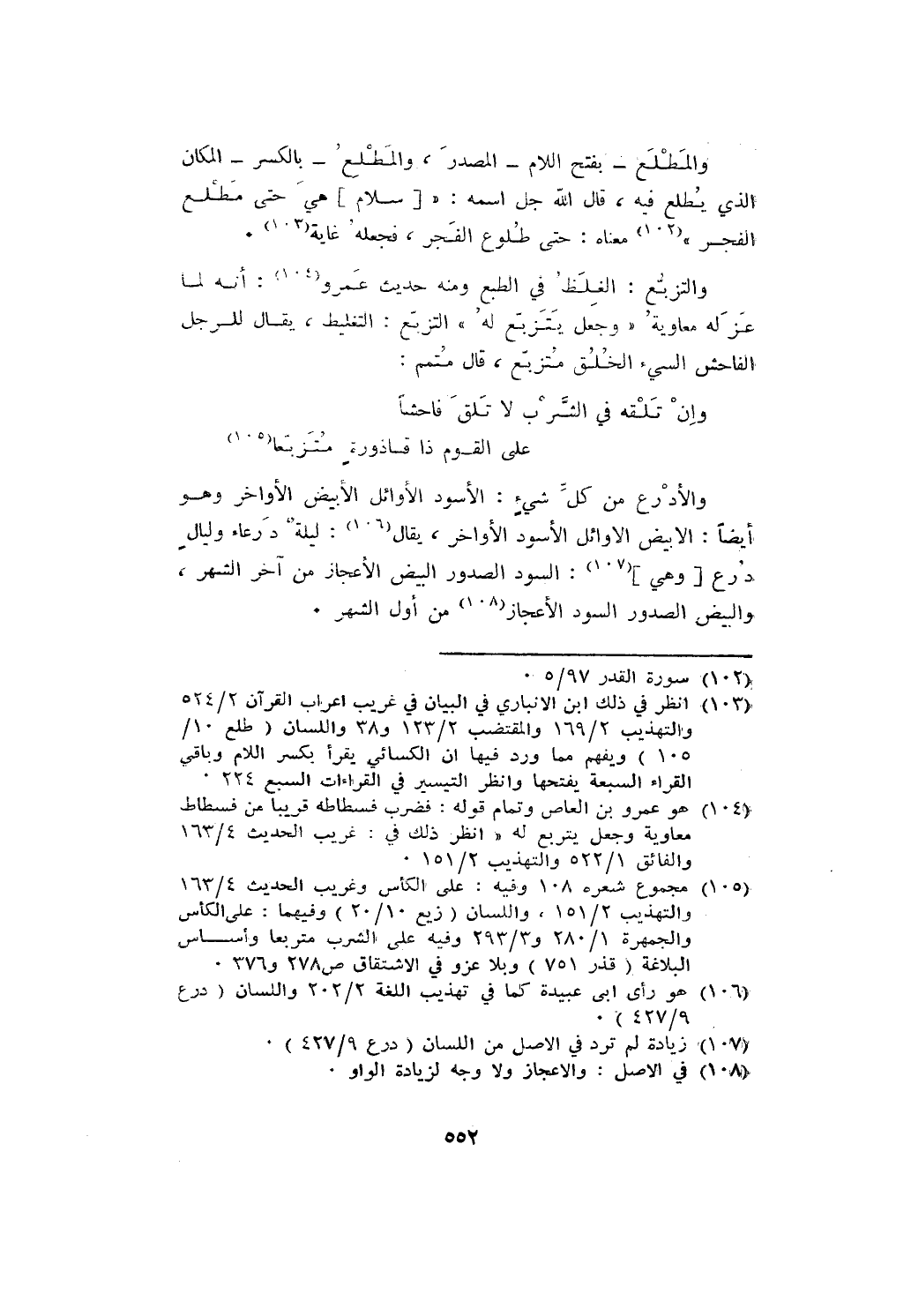 والمطلع - بفتح اللام- المصدر، والمطلع - بالكسر- المكان الذي يطلع فيه، قال الله جل اسمه: {سَلَامٌ هِيَ حَتَّى مَطْلَعِ الْفَجْرِ} معناه: حتى طلوع الفجر، فجعله غاية.