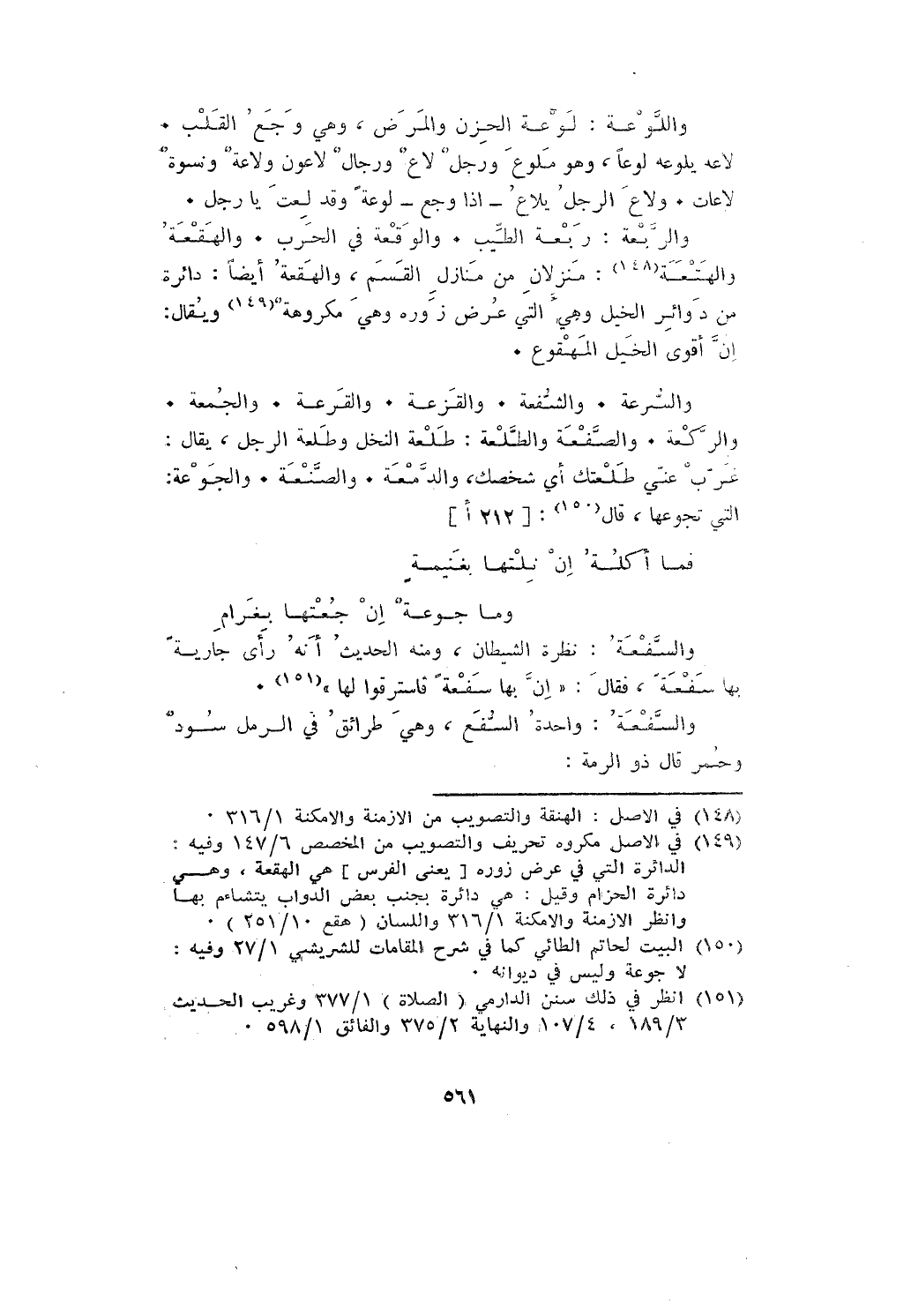 والسرعة. والشفعة. والقزعة. والقرعة. والجمعة. والركعة. والصفعة والطلعة: طلعة النخل وطلعة الرجل، يقال: غرب عنب طلعتك اي شخصك، والدمعة. والصنعة. والجوعة التي تجوعها، قال: