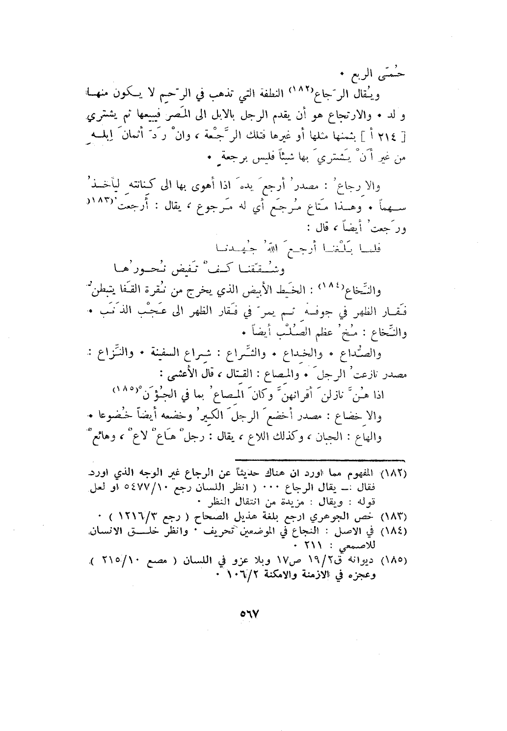 ويقال الرجاع النطفة التي تذهب في الرحم لا يكون منها ولد. والارتجاع هو أن يقدم الرجل بالإبل إلى المصر فيبيعها ثم يشتري بها شيئا فليس برجعة.