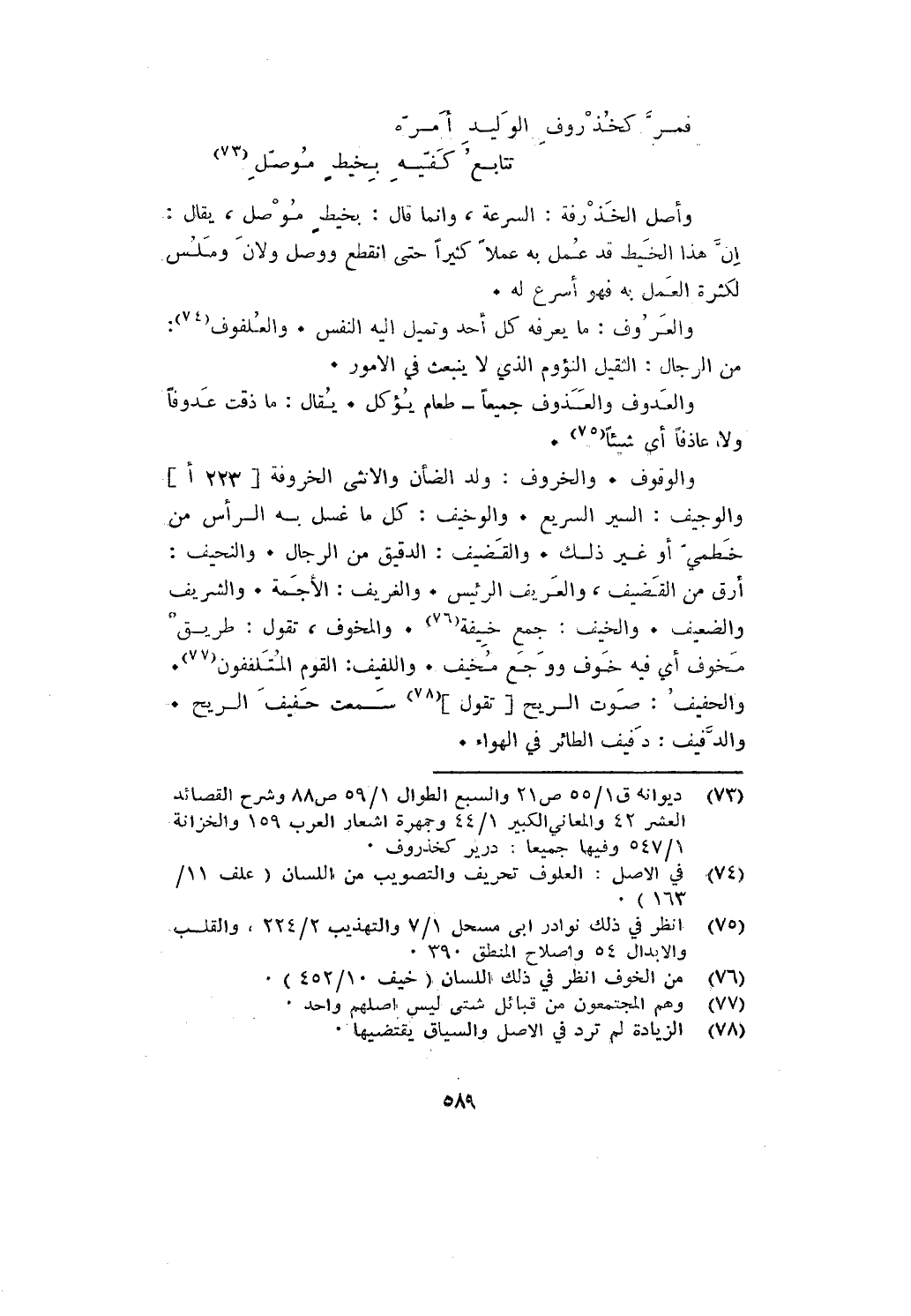 والوقوف. والخروف: ولد الضأن والأنثى الخروفة والوجييف: السير السريع. والوخيف: كل ما غسل به الرأس من خطمي أو غير ذلك. والقضيف: الدقيق من الرجال. والنحيف: أرق من القضيف، والعريف الرئيس. والغريف: الأجمة. والشريف والضعيف. والخيف: جمع خيفة. والمخوف، تقول: طريق مخوف أي فيه خوف ووجع مخيف. واللفيف: القوم الملتفون. والحفيف: صوت الريح تقول سمعت حفيف الريح. والدفيف: دفيف الطائر في الهواء.