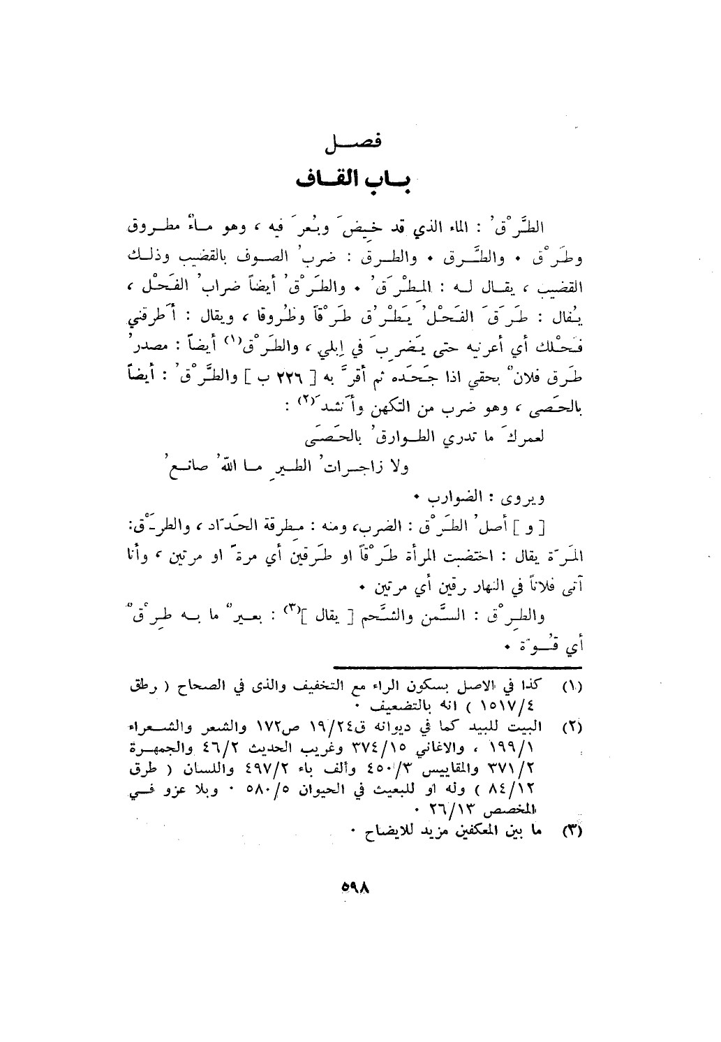 الطرق: الماء الذي قد خيض وبعر فيه، وهو ماء مطروق وطرق. والطرق. والطرق: ضرب الصوف بالقضيب وذلك القضيب، يقال له: المطرق. والطرق أيضا ضراب الفحل، يقال: طرق الفحل يطرق طرقا وطروقا، ويقال: أطرقني فحلك أي أعرنيه حتى يضرب في إبلي، والطرق أيضا: مصدر طرق فلان بحقي إذا جحده ثم أقر به والطرق: أيضا بالحصى، وهو ضرب من التكهن وأنشد: