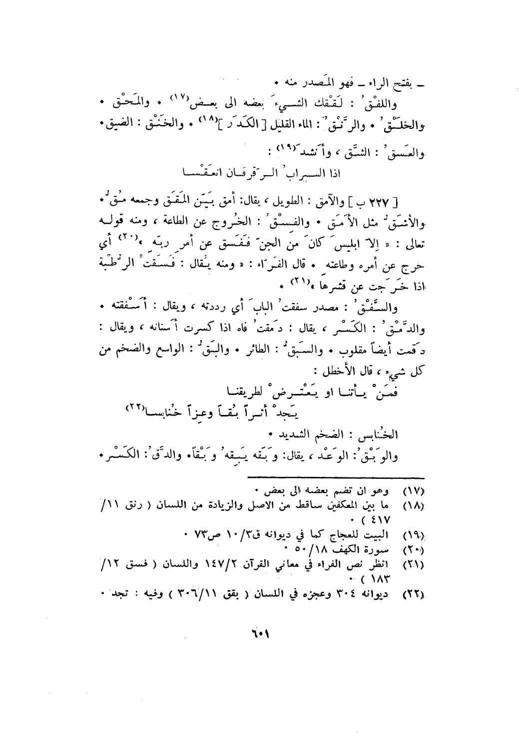 والآمق: الطويل، يقال: أمق بين المقق وجمعه مق. والأشق مثل الأمق. والفسق: الخروج عن الطاعة، ومنه قوله تعالى: {إِلَّا إِبْلِيسَ كَانَ مِنَ الْجِنِّ فَفَسَقَ عَنْ أَمْرِ رَبِّهِ} أي: خرج عن أمره وطاعته. قال الفراء: " ومنه يقال: فسقت الرطبة إذا خرجت عن قشرها ".