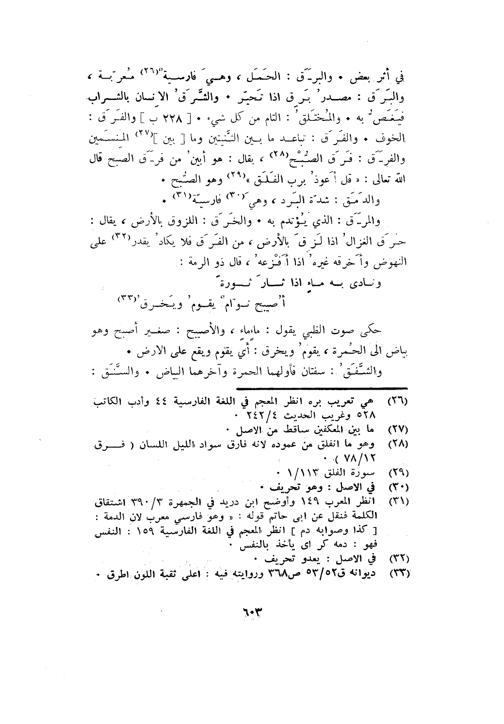 في أثر بعض. والبرق: الحمل، وهي فارسية معربة، والبرق: مصدر برق إذا تحير. والشرق الإنسان بالشراب فيغص به. والمختلق: التام من كل شيء. والفرق: الخوف. والفرق: تباعد ما بين الثنيتين وما بين المنسمين والفرق: فرق الصبح، يقال هو أبين من فرق الصبح قال الله تعالى: {قُلْ أَعُوذُ بِرَبِّ الْفَلَقِ} وهو الصبح.