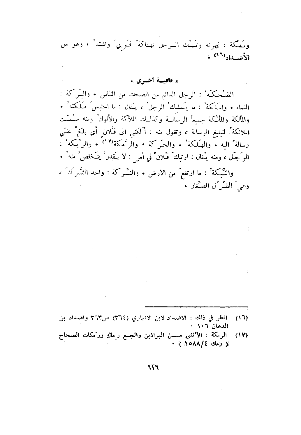 الضحكة: الرجل الدائم الضحك من الناس. والبركة: النماء. والملكة: ما يملك الرجل، يقال: ما احتبس ملكته. والمألكة والمألكة جميعا الرسالة وكذلك الملائكة والألوك ومنه سميت الملائكة لتبليغ الرسالة، وتقول منه: ألكني إلى فلان أي بلغ عني رسالة إليه. والهلكة. والحركة. والرمكة. والربكة: الوجل، ومنه يقال: ارتبك فلان في أمر: لا يقدر يتخلص منه.