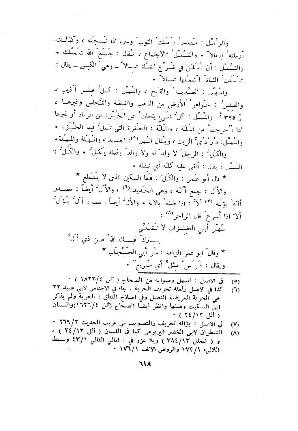 والمهل: الصديد والقيح، والمهل: كل فلز أذيب، والفلز: جواهر الأرض من الذهب والفضة والنحاس وغيرها، والمهل: كل شيء يتحات عن الخبزة من الرماد أو غيرها إذا أخرجت من الملة، والملة: الحفرة التي تمل فيها الخبزة.