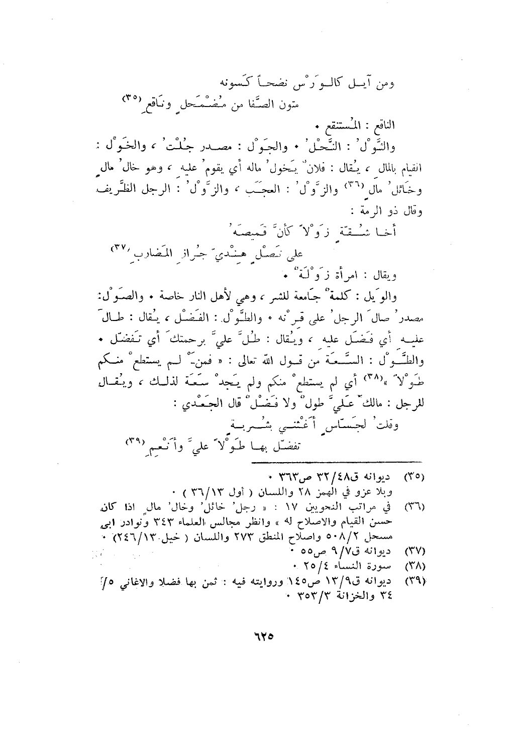 والويل: كلمة جامعة للشر، وهي لأهل النار خاصة. والصول: مصدر صال الرجل على قرنه. والطول: الفضل، يقال: طال عليه أي فضل عليه، ويقال: طل علي برحمتك اي تفضل. والطول: السعة من قول الله تعالى: {وَمَنْ لَمْ يَسْتَطِعْ مِنْكُمْ طَوْلًا} أي لم يستطع منكم ولم يجد سعة لذلك، ويقال للرجل: ما لك علي طول ولا فضل قال الجعدي: