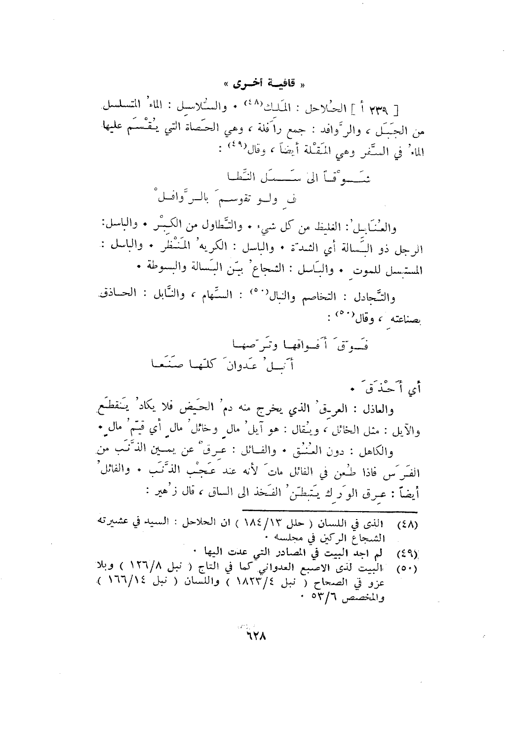 الحلاحل: الملك. والسلاسل: الماء المتسلسل من الجبل، والروافل: جمع رافلة، وهي الحصاة التي يقسم عليها الماء في السفر وهي المقلة أيضا، وقال: