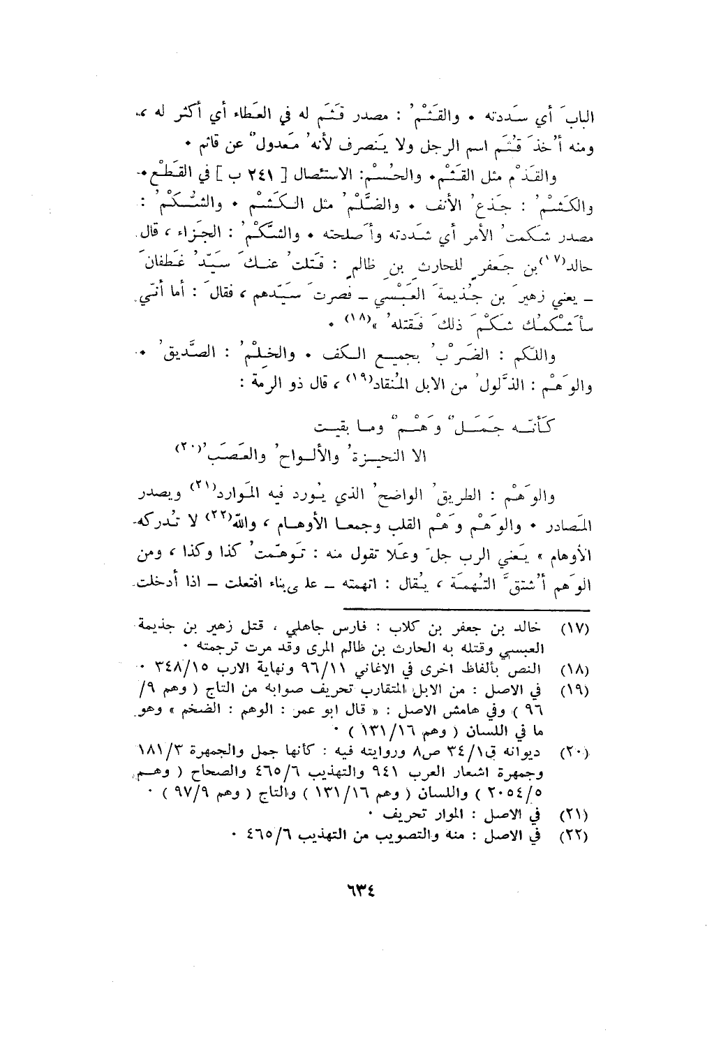 والقذم مثل القثم. والحسم: الاستئصال في القطع. والكشم: جذع الأنف. والضلم مثل الكشم. والشكم: مصدر شكمت الأمر أي شددته وأصلحته. والشكم: الجزاء، قال خالد بن جعفر للحارث بن ظالم: قتلت عنك سيد غطفان - يعني زهير بن جذيمة العبسي - فصرت سيدهم، فقال: أما إني سأشكمك شكم ذلك فقتله ".