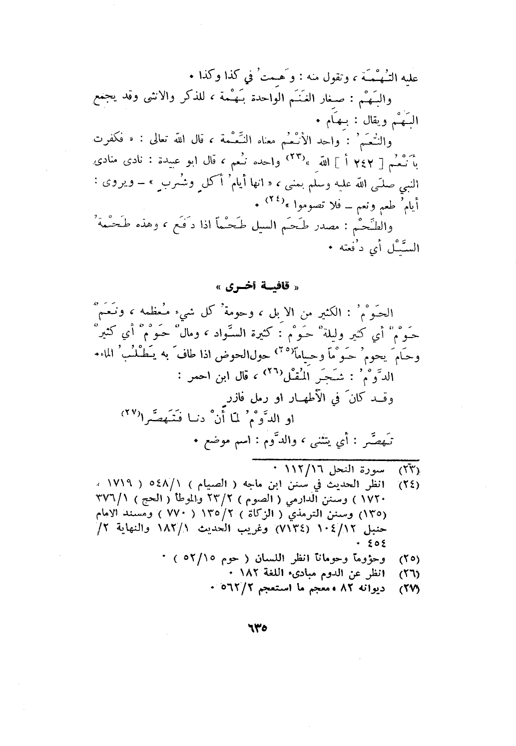 والنعم: واحد الأنعم معناه النعمة، قال الله تعالى: {فَكَفَرَتْ بِأَنْعُمِ اللَّهِ} واحده نعم، قال أبو عبيدة: نادى منادي النبي صلى الله عليه وسلم بمنى " إنها أيام أكل وشرب " - ويروى: أيام طعم ونعم - فلا تصوموا ".