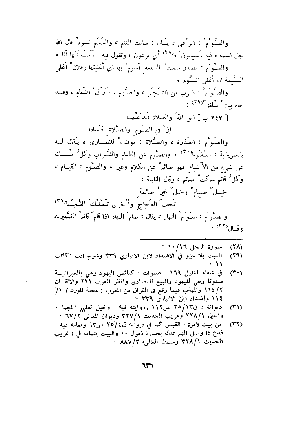 والصوم: العذرة، والصلاة: موقف النصارى، يقال له بالسريانية: صلوثا. والصوم عن الطعام والشراب وكل ممسك عن شيء من الأشياء فهو صائم عن الكلام وغير.