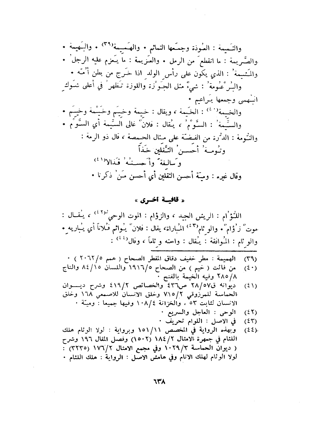 والتميمة: العوذة وجمعها التمائم. والهميمة. والبهيمة. والصريمة: ما انقطع من الرمل. والعزيمة: ما يعزم عليه الرجل، والمشيمة: الذي يكون على رأس الولد إذا خرج من بطن امه.