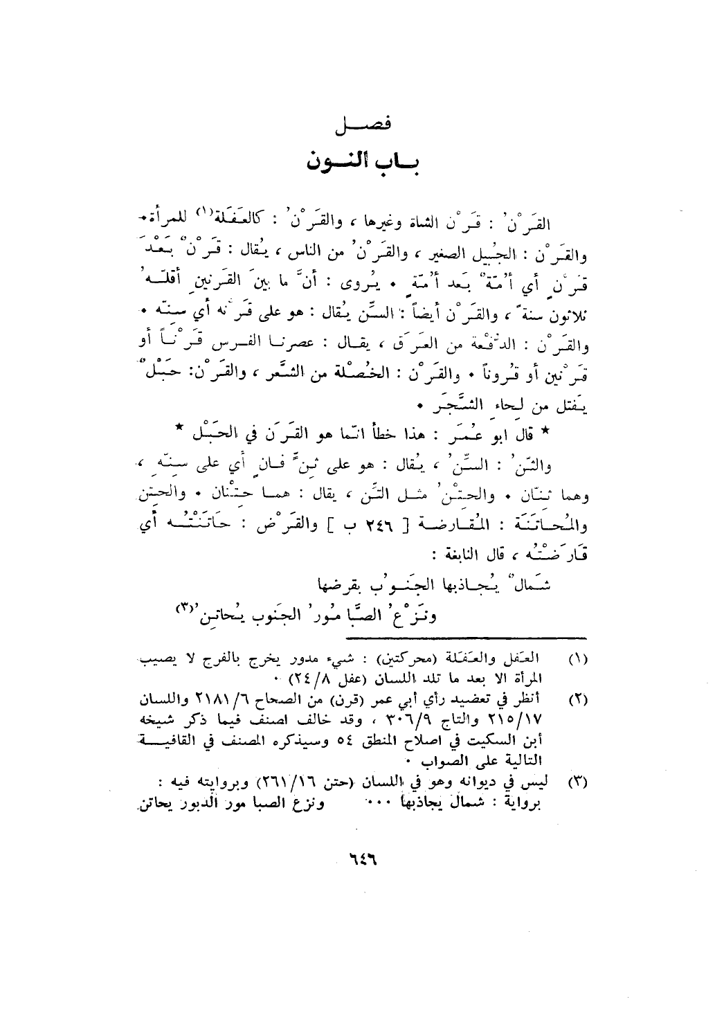 القرن: قرن الشاة وغيرها، والقرن: كالعفلة للمرأة. والقرن: الجبيل الصغير، والقرن من الناس، يقال: قرن بعد قرن أي أمة بعد أمة. يروى: أن ما بين القرنين أقله ثلاثون سنة، والقرن أيضا: السن يقال: هو على قرنه أي سنه. والقرن: الدفعة من العرق، يقال: عصرنا الفرس قرنا أو قرنين أو قرونا. والقرن: الخصلة من الشعر، والقرن: حبل يفتل من لحاء الشجر.