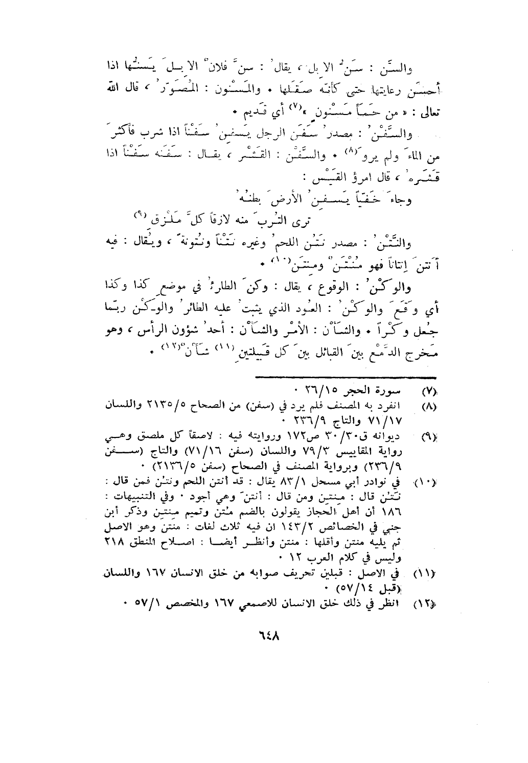 والسن: سن الإبل، يقال: سن فلان الإبل يسنها إذا أحسن رعايتها حتى كأنه صقلها. والمسنون: المصور، قال الله تعالى: {مِنْ حَمَإٍ مَسْنُونٍ} أي قديم.