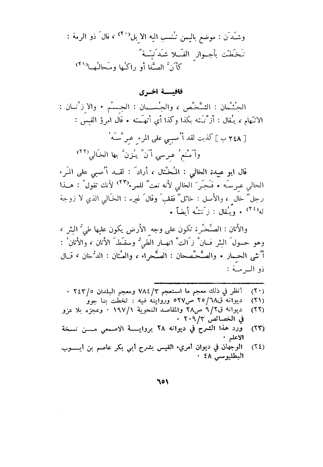 والأتان: الصخرة تكون على وجه الأرض يكون عليها طي البئر، وهو حول البئر فإن زالت أنهار الطي وسقط الأتان، والأتان: أنثى الحمار. والصحصحان: الصحراء، والعشان: الدخان، قال ذو الرمة:
