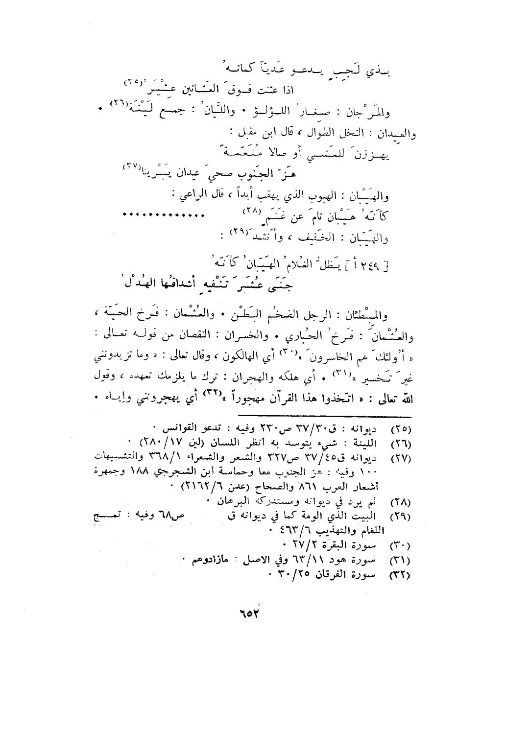 والمبطئان: الرجل الضخم البطن. والعثمان: فرخ الحية، والعثمان: فرخ الحبارى. والخسران: النقصان من قوله تعالى: {أُولَئِكَ هُمُ الْخَاسِرُونَ} أي الهالكون، وقال تعالى: {فَمَا تَزِيدُونَنِي غَيْرَ تَخْسِيرٍ} أي هلكة والهجران: ترك ما يلزمك تعهده، وقول الله تعالى: {اتَّخَذُوا هَذَا الْقُرْآنَ مَهْجُورًا} أي: يهجرونني وإياه.