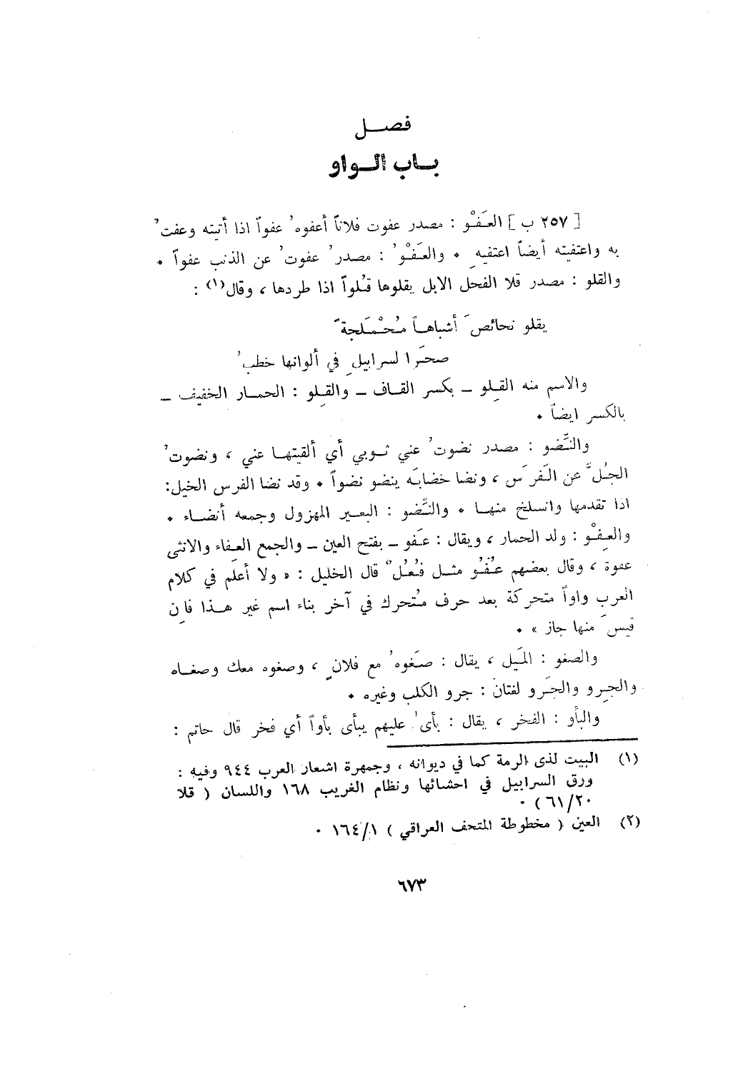 والعفو: ولد الحمار، ويقال: عفو - بفتح العين - والجمع العفاء والأنثى عفوة، وقال بعضهم عفو مثل فعل قال الخليل: " ولا أعلم في كلام العرب واوا متحركة بعد حرف متحرك في آخر بناء اسم غير هذا فإن قيس منها جاز ".