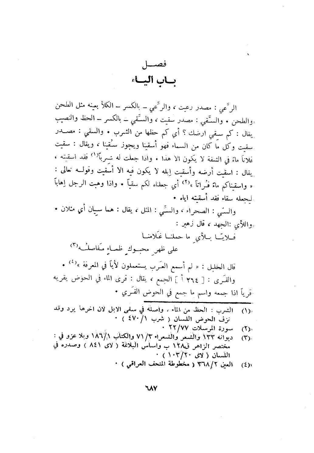 الرعي: مصدر رعيت، والرعي - بالكسر - الكلأ بعينه مثل الطحن والطحن. والسقي: مصدر سقيت، والسقي - بالكسر - الحظ والنصيب يقال: كم سقي أرضك؟ أي كم حظها من الشرب. والسقي: مصدر سقيت وكل ما كان من السماء فهو أسقينا ويجوز سقينا، ويقال: سقيت فلانا ماء في الشفة لا يكون إلا هذا. وإذا جعلت له شربا فقد أسقيته، يقال: أسقيت أرضه وأسقيت إبلهلا يكون فيه إلا أسقيت وقوله تعالى: {وَأَسْقَيْنَاكُمْ مَاءً فُرَاتًا} أي جعلناه لكم سقيا. وإذا وهبت الرجل إهابا ليجعله سقاء فقد اسقيته إياه.