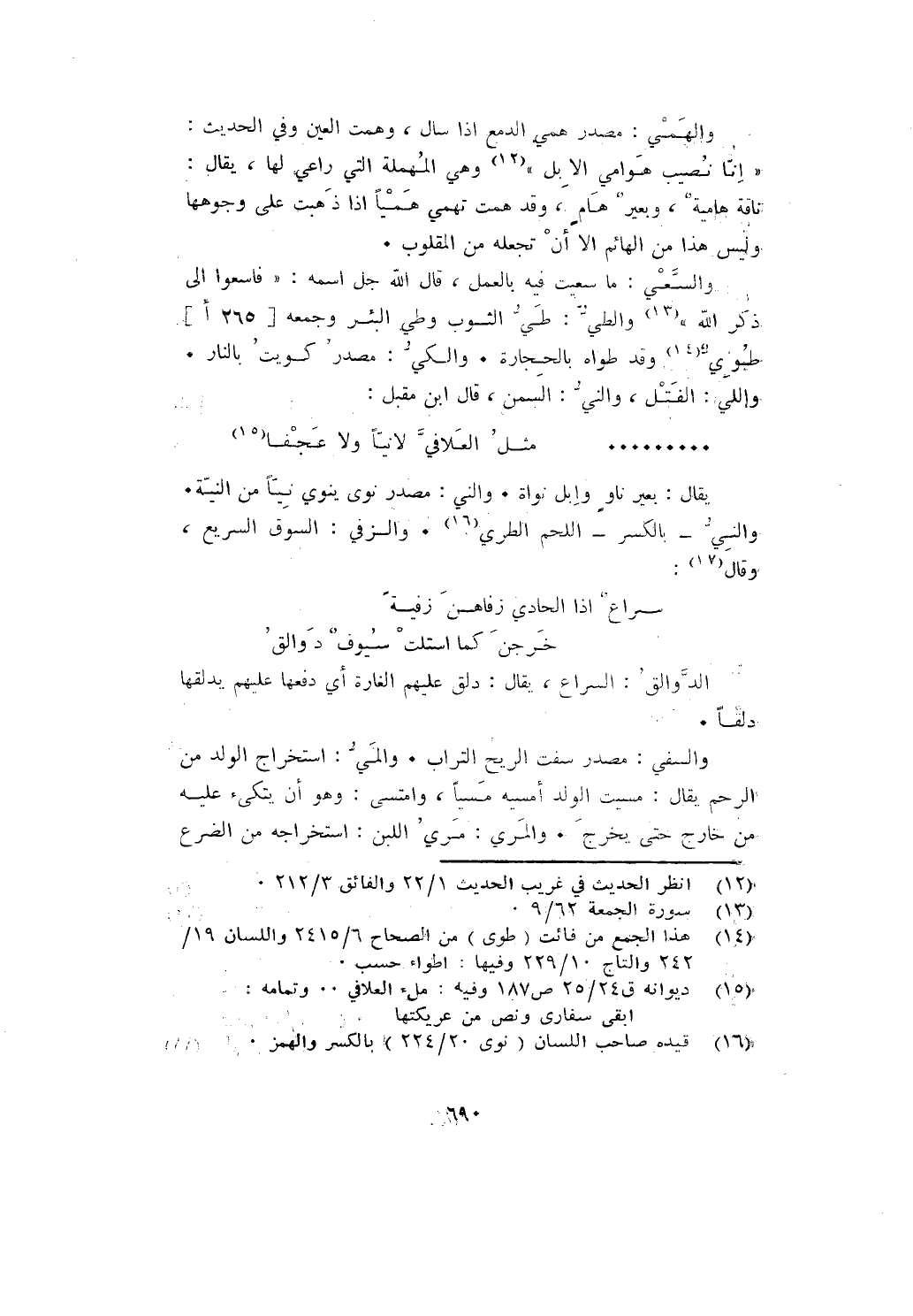 والسعي: ما سعيت فيه بالعمل، قال الله جل اسمه: {فَاسْعَوْا إِلَى ذِكْرِ اللَّهِ} والطي: طي الثوب وطي البئر وجمعه طيوي وقد طواه بالحجارة. والكي: مصدر كويت بالنار. واللي: الفتل، والني: السمن، قال ابن مقبل: