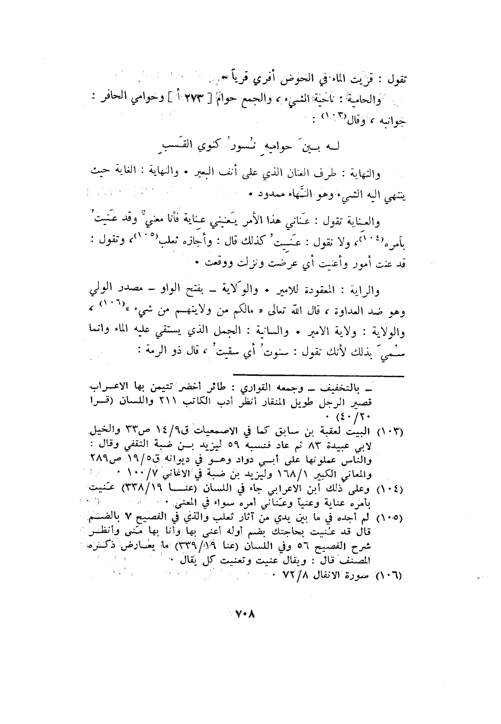 والراية: المعقودة للأمير. والولاية - بفتح الواو - مصدر الولي وهو ضد العداوة، قال الله تعالى: {مَا لَكُمْ مِنْ وَلَايَتِهِمْ مِنْ شَيْءٍ}، والولاية: ولاية الأمير. والسانية: الجمل الذي يستقي عليه الماء وإنما سمي بذلك لأنك تقول: سنوت أي سقيت، قال ذو الرمة: