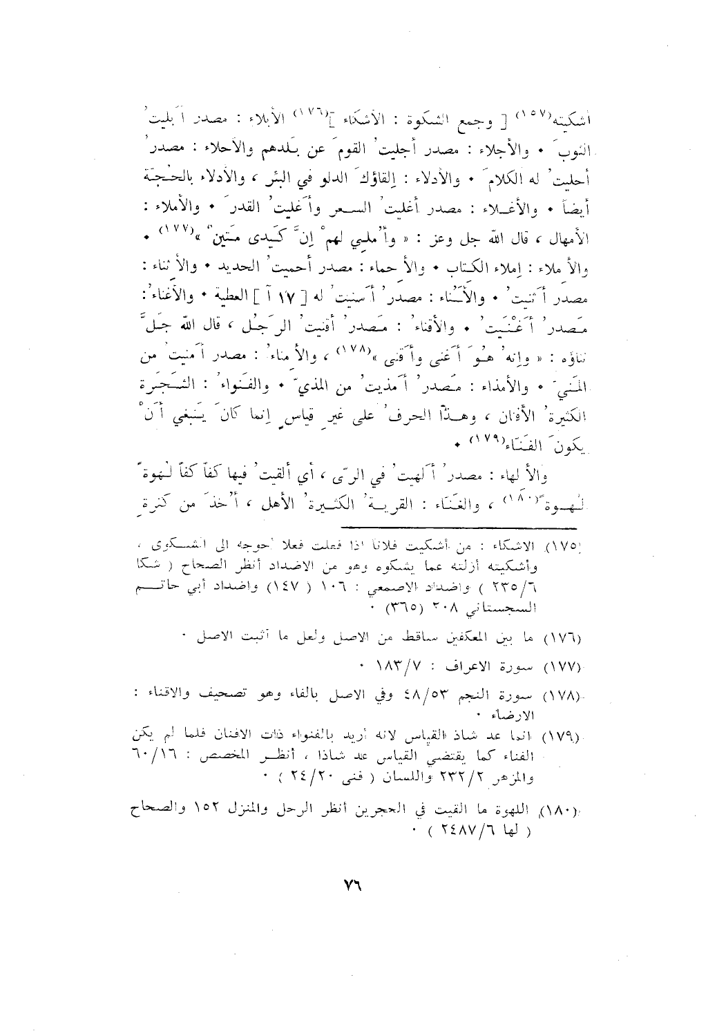 والإملاء: إملاء الكتاب. والإحماء: مصدر أحميت الحديد. والإثناء: مصدر أثنيت. والإسناء: مصدر أسنيتُ له [17 آ] العطية. والإغناء: مصدر أغنيت. والإقناء: مصدر أقنيت الرجل، قال الله جل ثناؤه: {وَأَنَّهُ هُوَ أَغْنَى وَأَقْنَى}، والإمناء: مصدر أَمْنَيْتُ من المَنِيِّ. والإمذاء: مصدر أمذيت من المذي. والفنواء: الشجرة الكثيرة الأفنان، وهذا الحرف على غير قياس إنما كان ينبغي أن يكون الفناء.