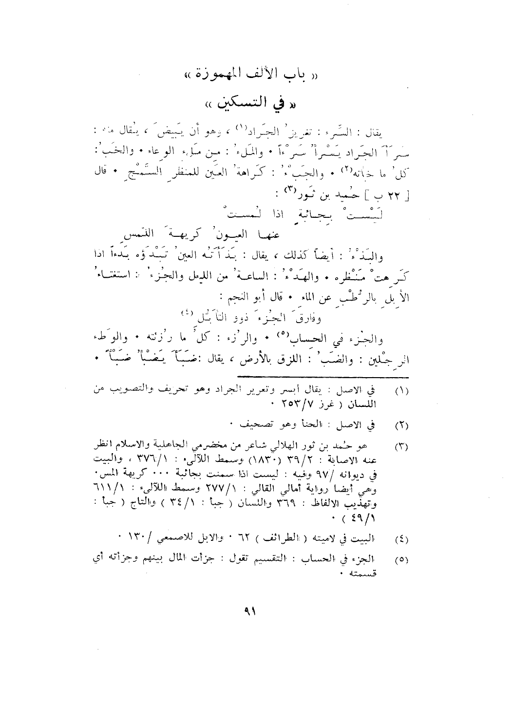 يقال: السِّرء: تَعْزيزُ الْجَرَاد، وهو أن يَبِيضَ، يُقَالُ منه: سَرَأَ الْجَرَادُ يَسْرَأُ سَرْءًأ. والْمَلء: من ملء الوعاء. والْخَب: كل ما خبأته. والجَبْءُ: كَرَاهَةُ العين للمنظر السَّمْجِ. قال [22 ب] حُمَيد بن ثور: