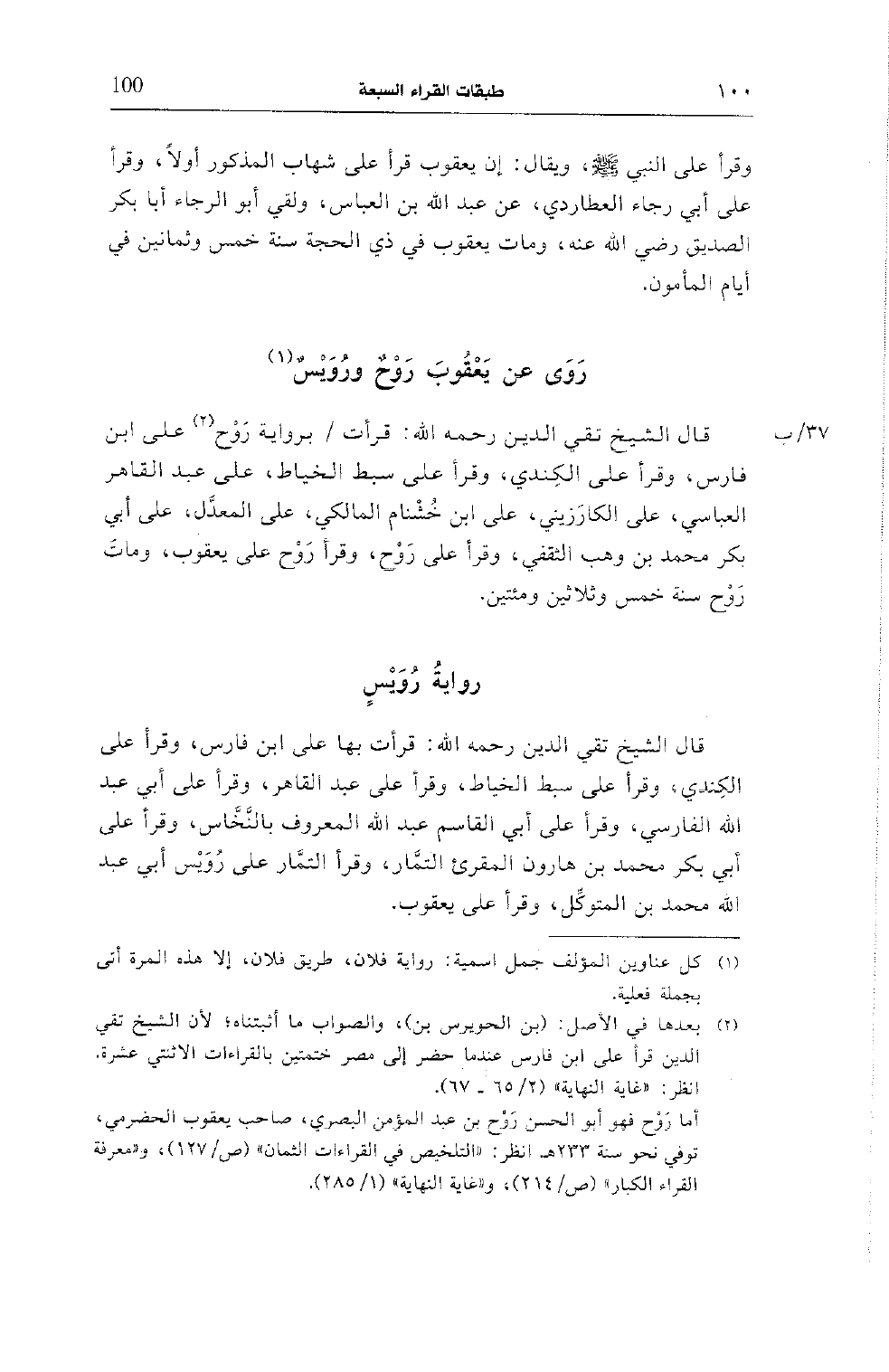 قال الشيخ تقي الدين رحمه الله: قرأت/ برواية روح (¬2) على ابن فارس، وقرأ على الكندي، وقرأ على سبط الخياط، على عبد القاهر العباسي، على الكارزيني، على ابن خشنام المالكي، على المعدّل، على أبي بكر محمد بن وهب الثقفي، وقرأ على روح، وقرأ روح على يعقوب، ومات روح سنة خمس وثلاثين ومائتين.