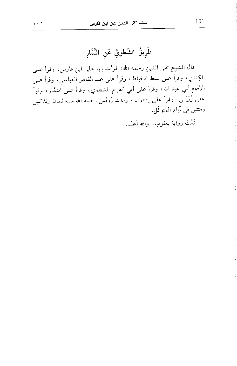 قال الشيخ تقي الدين رحمه الله: قرأت بها على ابن فارس، وقرأ على الكندي، وقرأ على سبط الخياط، وقرأ على عبد القاهر العباسي، وقرأ على الإمام أبي عبد الله، وقرأ على أبي الفرج الشطوي، وقرأ على التّمّار، وقرأ على رويس، وقرأ على يعقوب، ومات رويس رحمه الله سنة ثمان وثلاثين ومائتين في أيام المتوكّل.
