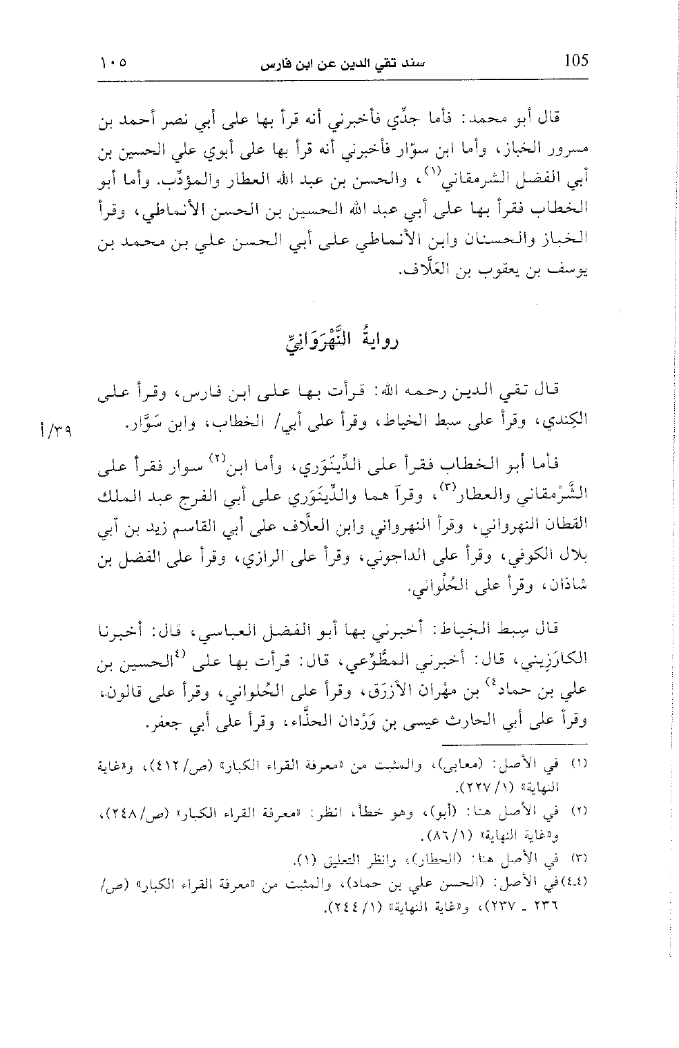 قال تقي الدين رحمه الله: قرأت بها على ابن فارس، وقرأ على الكندي، وقرأ على سبط الخياط، وقرأ على أبي/ الخطاب، وابن سوّار.