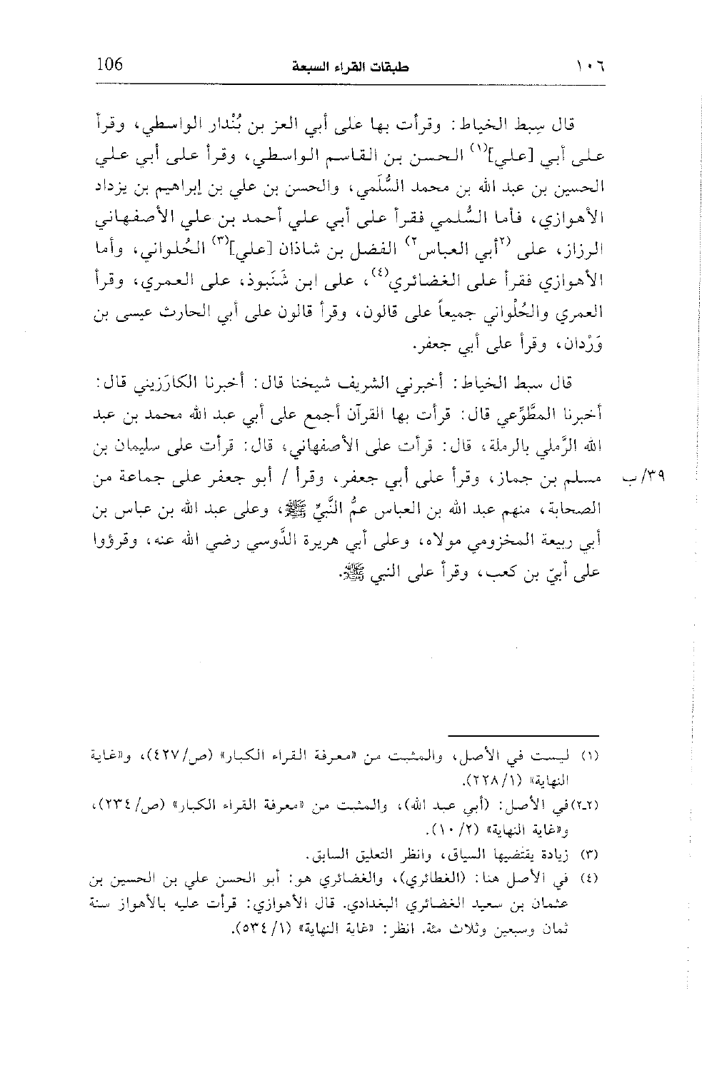 (¬4) في الأصل هنا: (الغطائري)، والغضائري هو: أبو الحسن علي بن الحسين بن عثمان بن سعيد الغضائري البغدادي. قال الأهوازي: قرأت عليه بالأهواز سنة ثمان وسبعين وثلاث مائة. انظر: «غاية النهاية» (1/ 534).