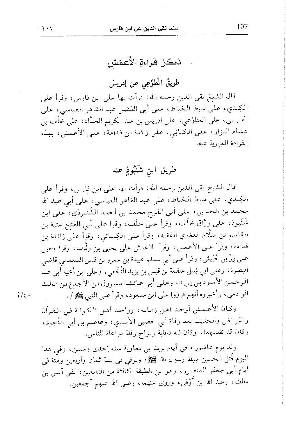 قال الشيخ تقي الدين رحمه الله: قرأت بها على ابن فارس، وقرأ على الكندي، على سبط الخياط، على أبي الفضل عبد القاهر العباسي، على الفارسي، على المطوّعي، على إدريس بن عبد الكريم الحدّاد، على خلف بن هشام البزار، على الكتاني، على زائدة بن قدامة، على الأعمش، بهذه القراءة المروية عنه.