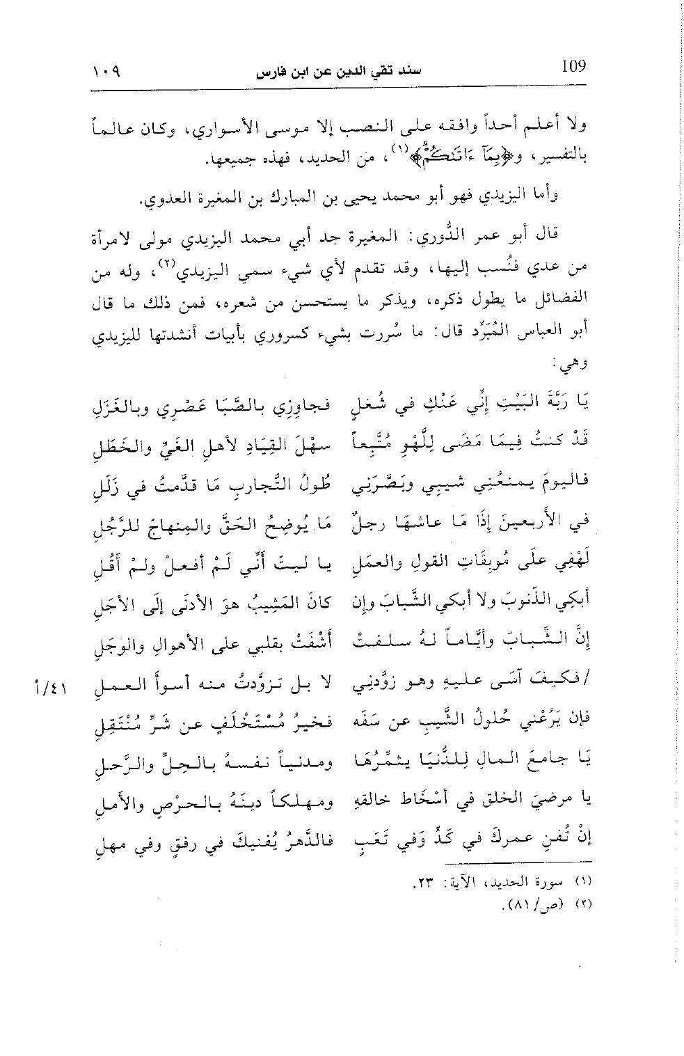 قال أبو عمر الدّوري: المغيرة جد أبي محمد اليزيدي مولى لامرأة من عدي فنسب إليها، وقد تقدم لأي شيء سمي اليزيدي (¬2)، وله من الفضائل ما يطول ذكره، ويذكر ما يستحسن من شعره، فمن ذلك ما قال أبو العباس المبرّد قال: ما سررت بشيء كسروري بأبيات أنشدتها لليزيدي وهي: