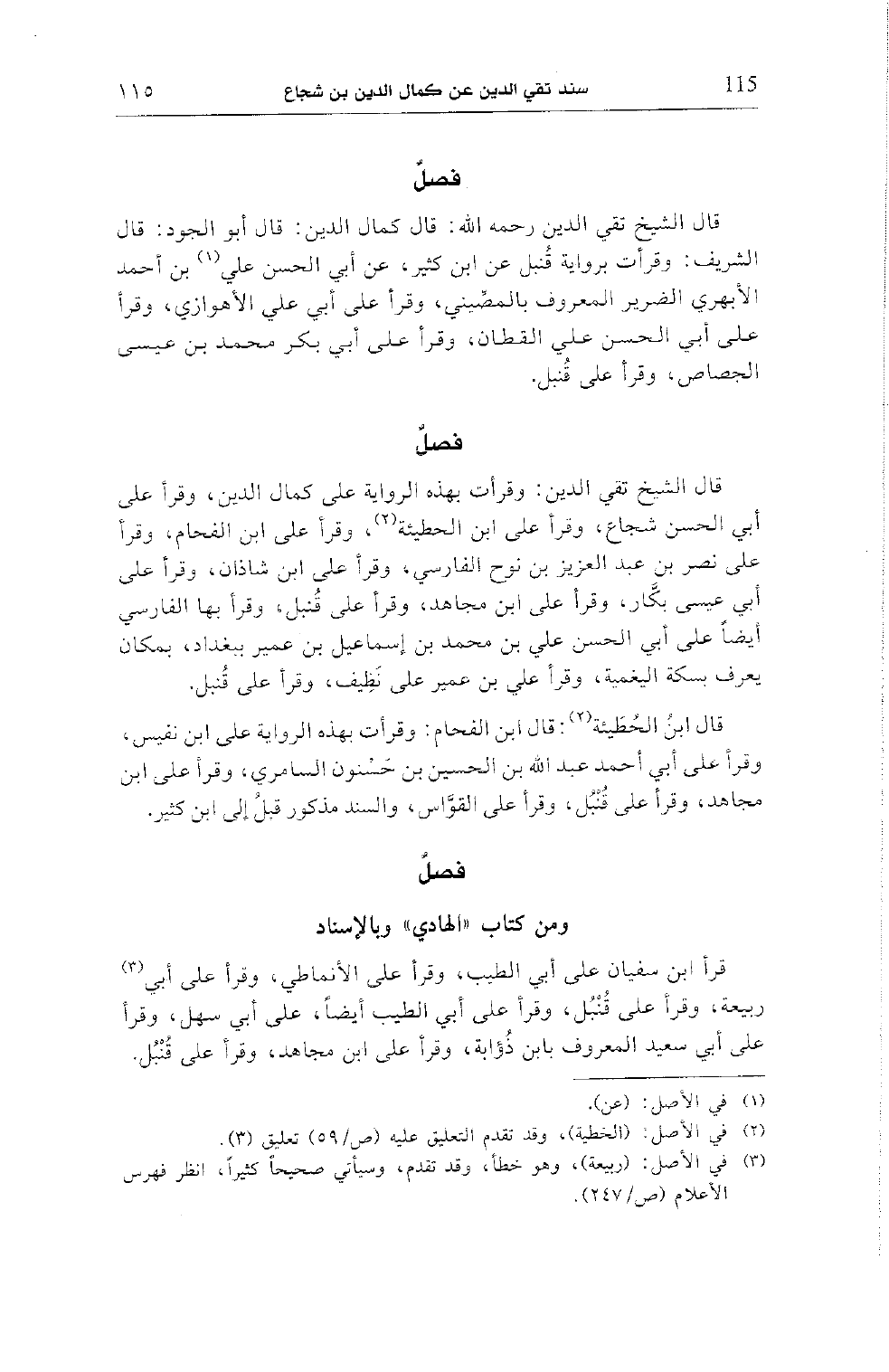 قال الشيخ تقي الدين: وقرأت بهذه الرواية على كمال الدين، وقرأ على أبي الحسن شجاع، وقرأ على ابن الحطيئة (¬2)، وقرأ على ابن الفحام، وقرأ على نصر بن عبد