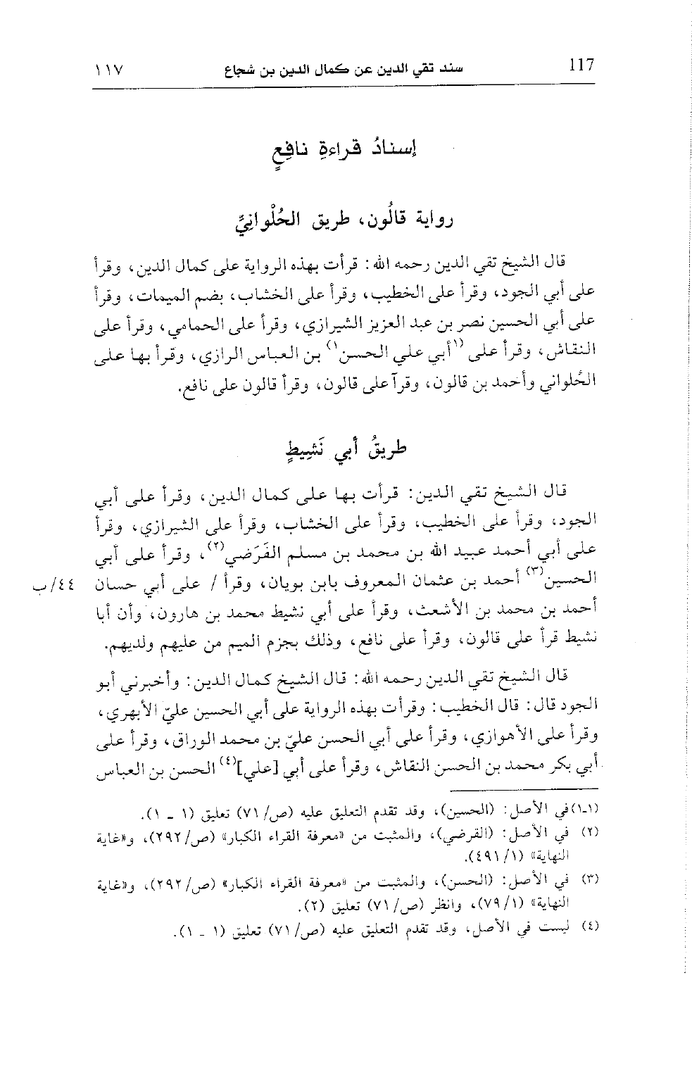 قال الشيخ تقي الدين رحمه الله: قرأت بهذه الرواية على كمال الدين، وقرأ على أبي الجود، وقرأ على الخطيب، وقرأ على الخشاب، بضم الميمات، وقرأ على أبي الحسين نصر بن عبد العزيز الشيرازي، وقرأ على الحمامي، وقرأ على النقاش، وقرأ على [أبي علي الحسن] (¬1) بن العباس الرازي، وقرأ بها على الحلواني وأحمد بن قالون، وقرآ على قالون، وقرأ قالون على نافع.